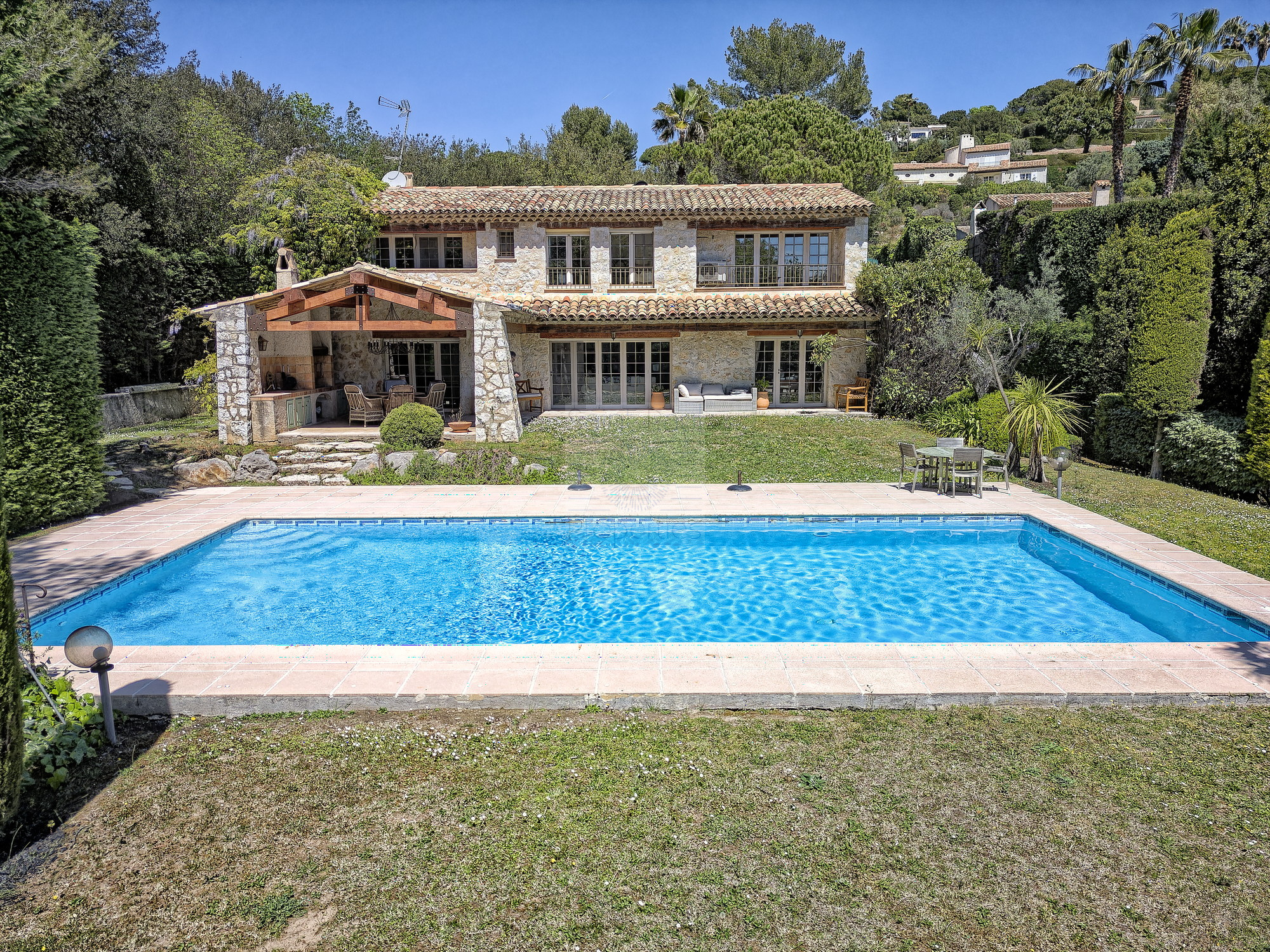 SERENITE et CHARME! Située à quelques minutes à pied du centre du village de Roquefort-les-Pins, au bout d'une impasse et au calme, cette jolie BASTIDE de 260 m² offre un cadre de vie unique. Le terrain clôturé et arboré d'environ 2300 m² accueille une piscine (au sel) de forme libre et des espaces extérieurs parfaitement aménagés pour profiter de la douceur de vivre provençale (multiples terrasses, salon d'été, espace barbecue, grande plage en bois autour de la piscine). L'intérieur de la maison est un mélange parfait entre confort et caractère. Un hall élégant dessert un vaste séjour lumineux d'environ 60 m², avec une belle hauteur sous plafond et une cheminée imposante, communiquant avec une grande cuisine entièrement équipée. A ce même niveau, vous trouvez deux chambres de plain-pied, chacune disposant de sa propre salle de bains/WC, ainsi qu’un bureau, une arrière-cuisine et un WC invité. À l’étage, la chambre parentale bénéficie d’un balcon privatif, un dressing et une salle de bains/WC en suite. Une seconde chambre, également orientée plein sud, dispose d’une salle de douche/WC et profite d’une belle luminosité. Toutes les pièces sont lumineuses, spacieuses et bien distribuées, avec de nombreux rangements. La maison est très bien entretenue et dans un état IMPECCABLE. La maison de gardien (d'environ 25m2) et les abris voiture sont situés dans un espace bien distinct, qui protège l'intimité de la propriété principale. Prestations: panneaux solaires, climatisation résersible, portail électrique, interphone, caméras, fosse septique neuve, piscine Diffazur. Roquefort-les-Pins, village apprécié pour sa qualité de vie, se situe à mi-chemin entre la mer et les montagnes, offrant ainsi un accès facile à toutes les commodités : commerces, écoles, restaurants… tout en étant à seulement 20 minutes de l’aéroport de Nice et à quelques minutes des terrains de golf voisins. Une maison clé en main à visiter rapidement!