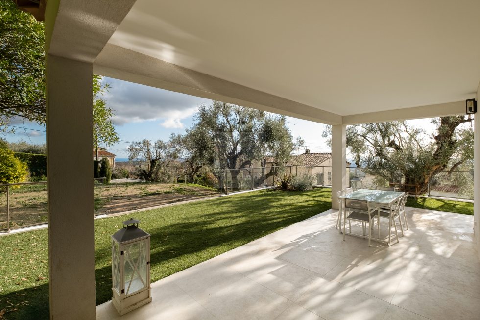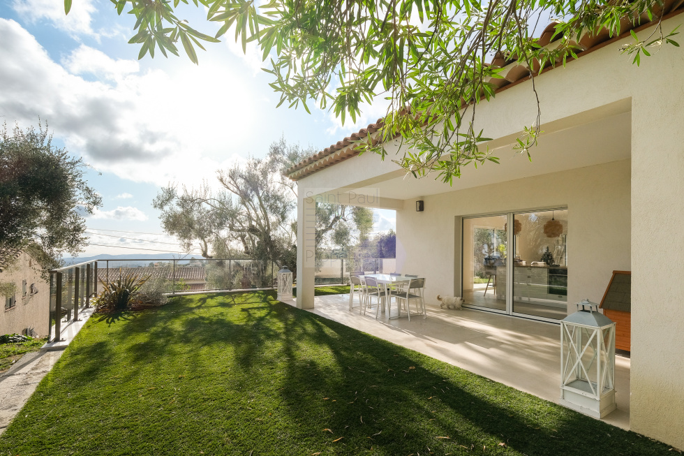 Bastide construite en 2023, d'une surface de 147m2 habitables érigée sur une parcelle de terrain de 1163m2. A seulement 300m à pied du village Très lumineuse et parfaitement agencée, son exposition plein sud et sud-ouest offre un ensoleillement total et une vue magnifique sur la mer jusqu'au Cap d'Antibes. Elle se compose, de plain-pied, d'une entrée spacieuse, d'une chambre parentale avec salle d'eau et dressing, d'un salon avec toilettes invités, d'une salle à manger avec une grande cuisine ouverte de menuiseries italiennes, donnant sur une terrasse de 48m2. Un cellier, utile et fonctionnel, de style verrière parisienne complète la cuisine. A l'étage, 3 Chambres vue mer et collines, très lumineuses, une salle de bain et un wc suspendu indépendant. Climatisation réversible gainée, double vitrage à galandage, 3 stationnements extérieurs et un garage fermé attenant de 22m2 avec buanderie complètent ce bien. De nombreuses prestations apportent confort et sécurité : Portail électrique, visiophone, porte blindée 5 points avec serrure à empreinte digitale, climatisation, volets et lumière connectés. Un permis accepté et purgé pour une piscine d'une dimension de 4x8m. Assainissement collectif. Une opportunité unique à saisir. Photo avec "projection" piscine implantée sur demande.