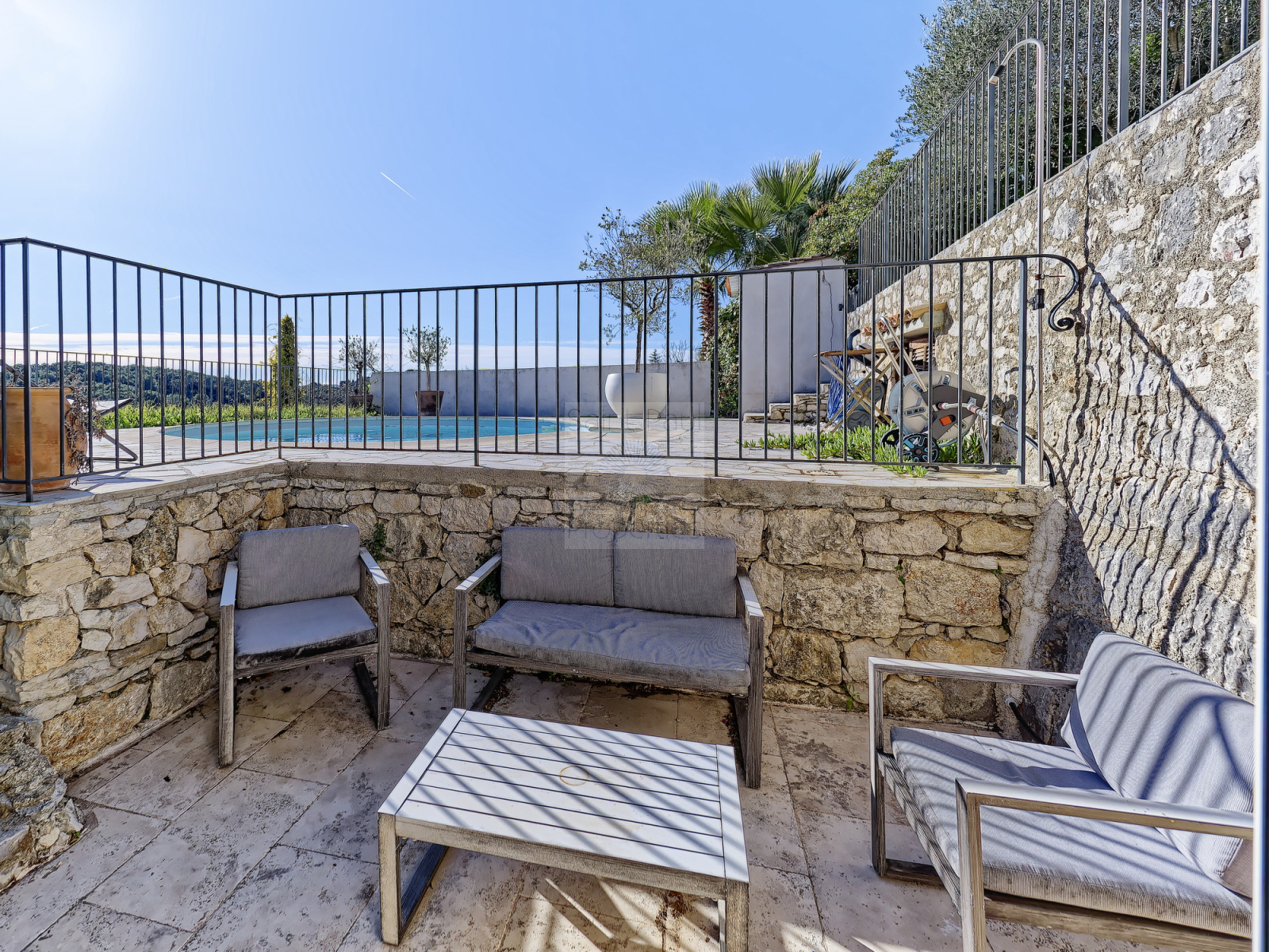 A l'extérieur : Ravissante piscine bénéficiant d'une vue imprenable, d'agréables espaces où il fait bon vivre, de superbes murs en pierre sèche rajoutent un charme tout particulier... Un grand garage indépendant vient compléter l'ensemble.