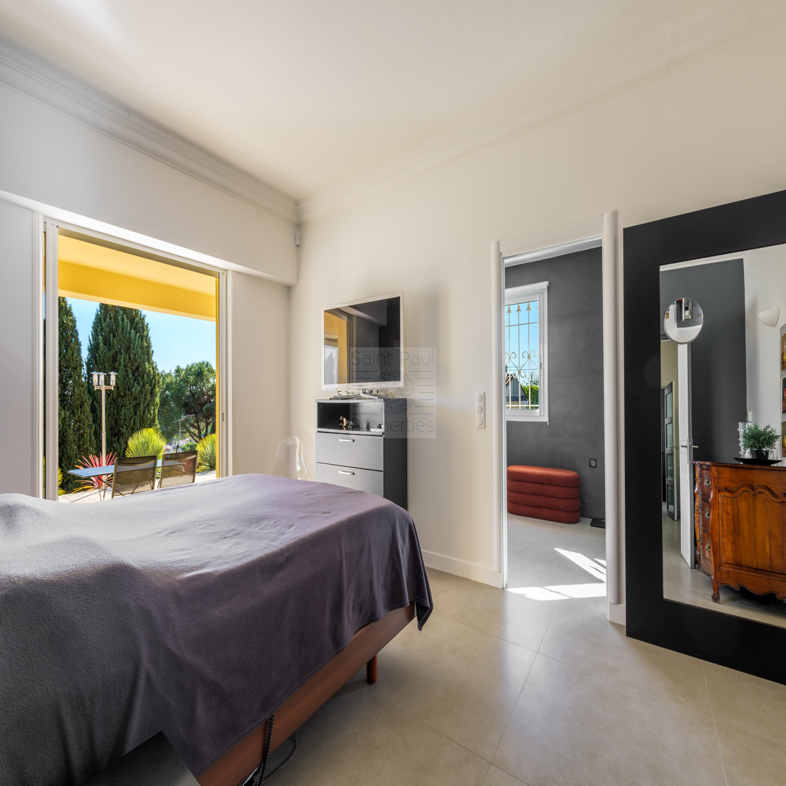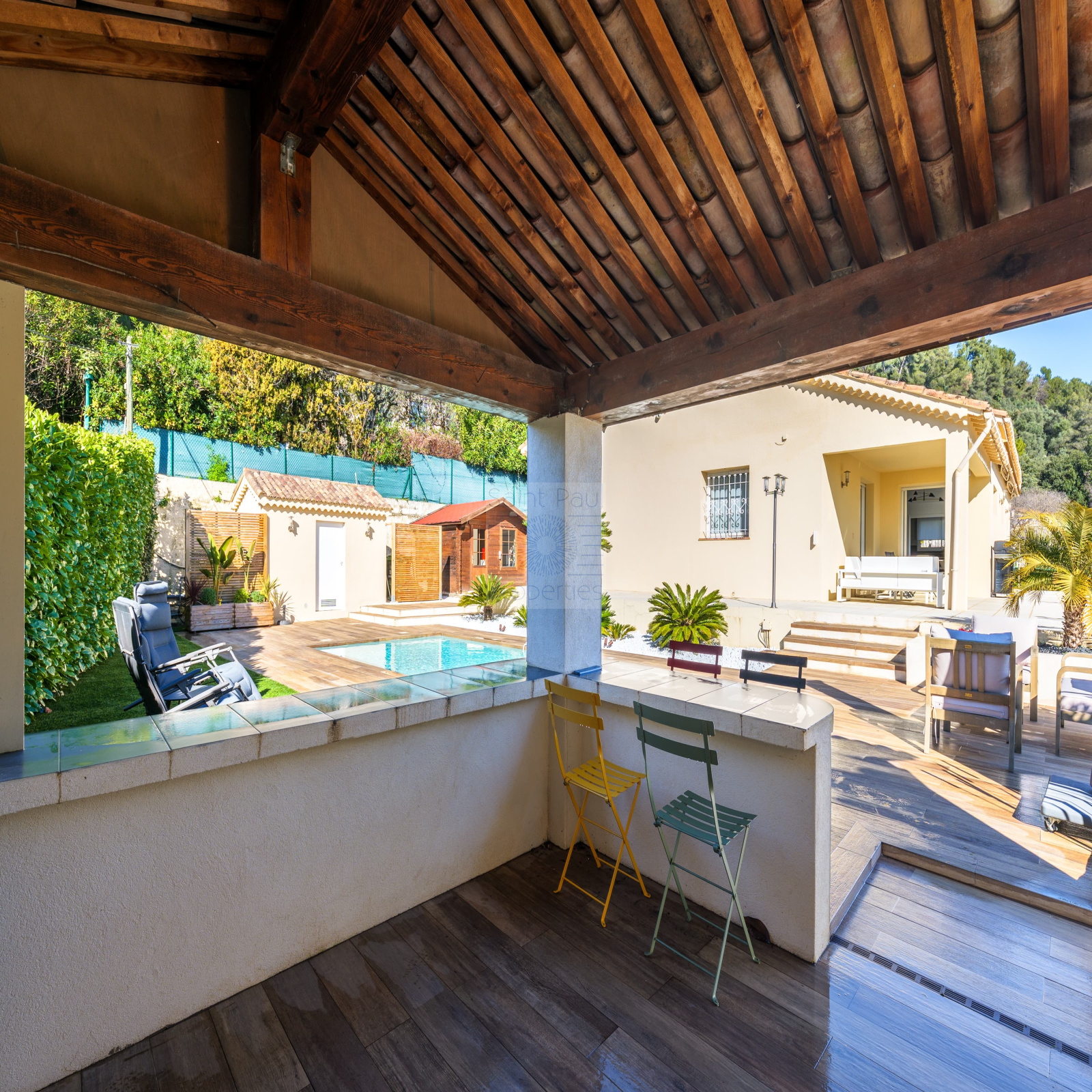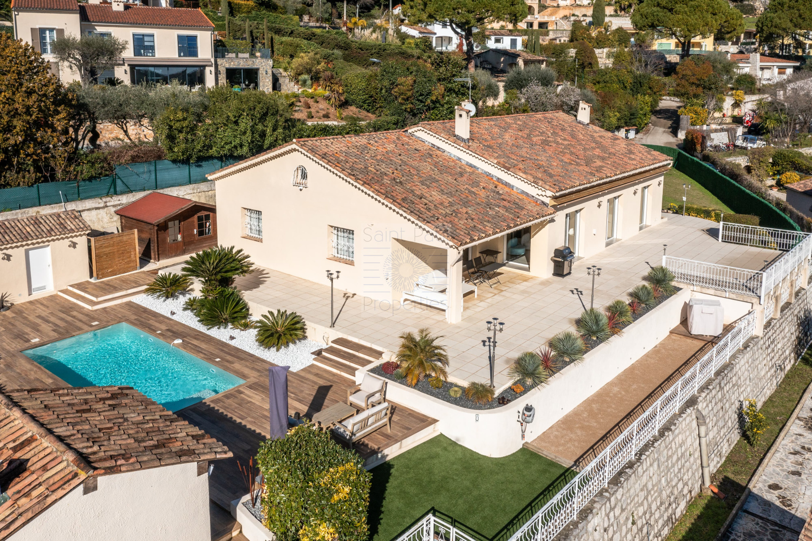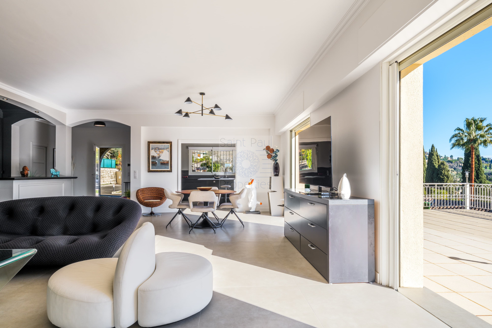 En position dominante bénéficiant d’une belle vue dégagée en Sud sur la vallée et le village de Saint Paul de Vence, magnifique villa 4 pièces de 192 m² entièrement rénovée.