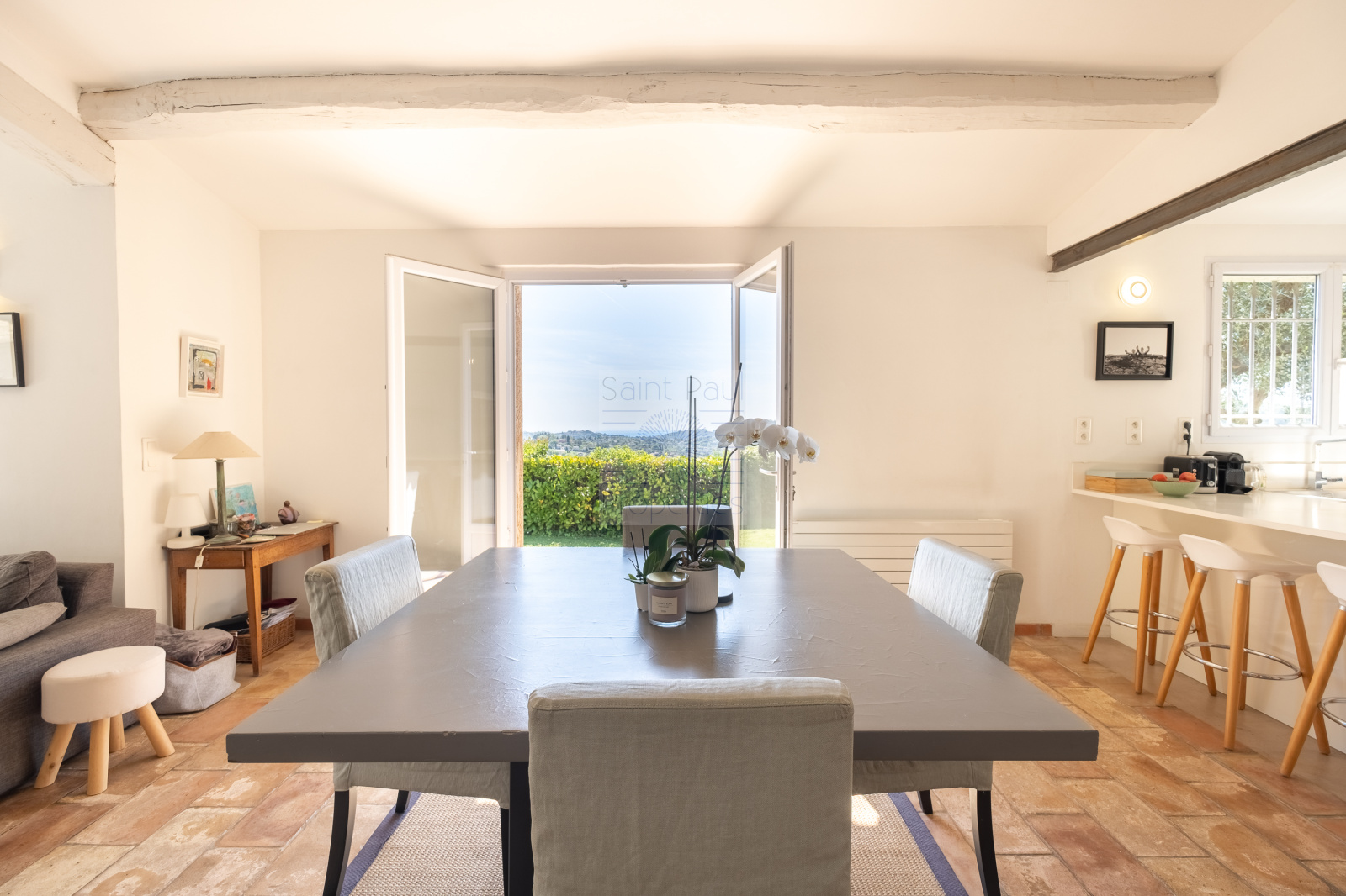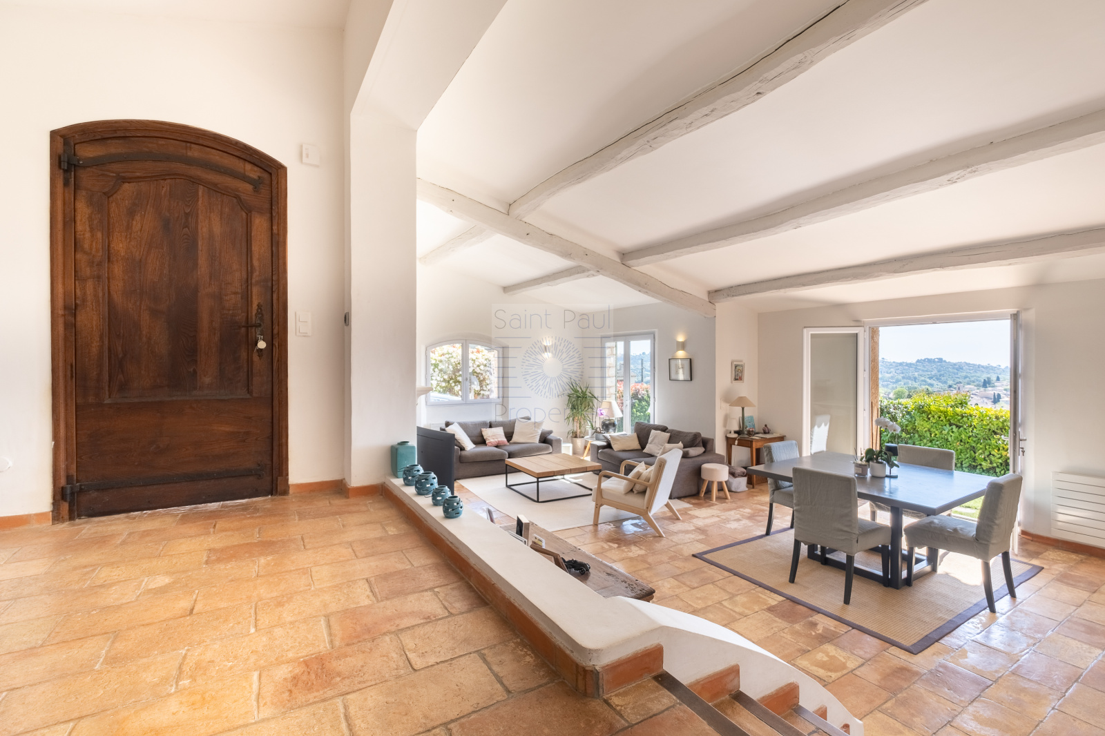 Une belle entrée desservant un spacieux séjour avec belle hauteur sous plafond, une cuisine américaine parfaitement équipée, l'ensemble idéalement ensoleillé ouvrant sur les extérieurs, dont une agréable terrasse ombragée, lieu idéal de convivialité.