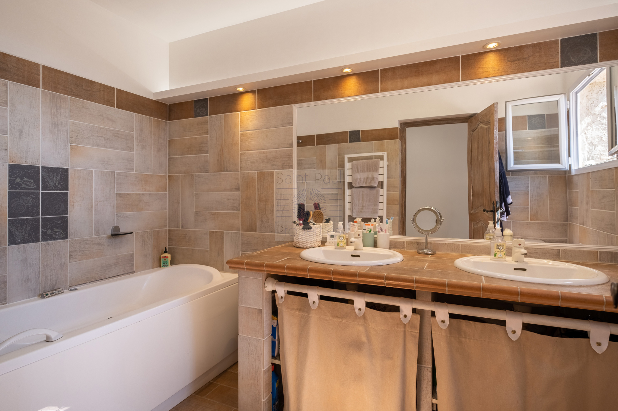 Sise sur un beau terrain plat d'environ 900m2 - à distance pédestre du charmant village de La Colle sur Loup dans lequel l'on retrouve de nombreux commerces, commodités et écoles - la maison d'une superficie d'environ 175m2 se compose de: