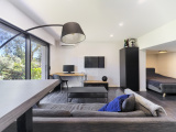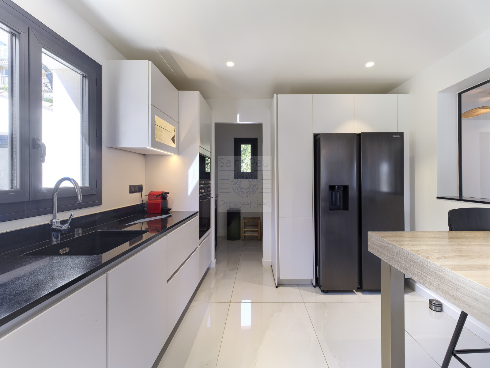 Niveau principal: Une belle entrée avec dressing et wc invités, une superbe cuisine américaine et arrière cuisine parfaitement équipées, une salle à manger, un spacieux séjour très lumineux grâce à de nombreuses baies vitrées ( à galandage pour la plupart), une jolie chambre avec sa salle de douche.