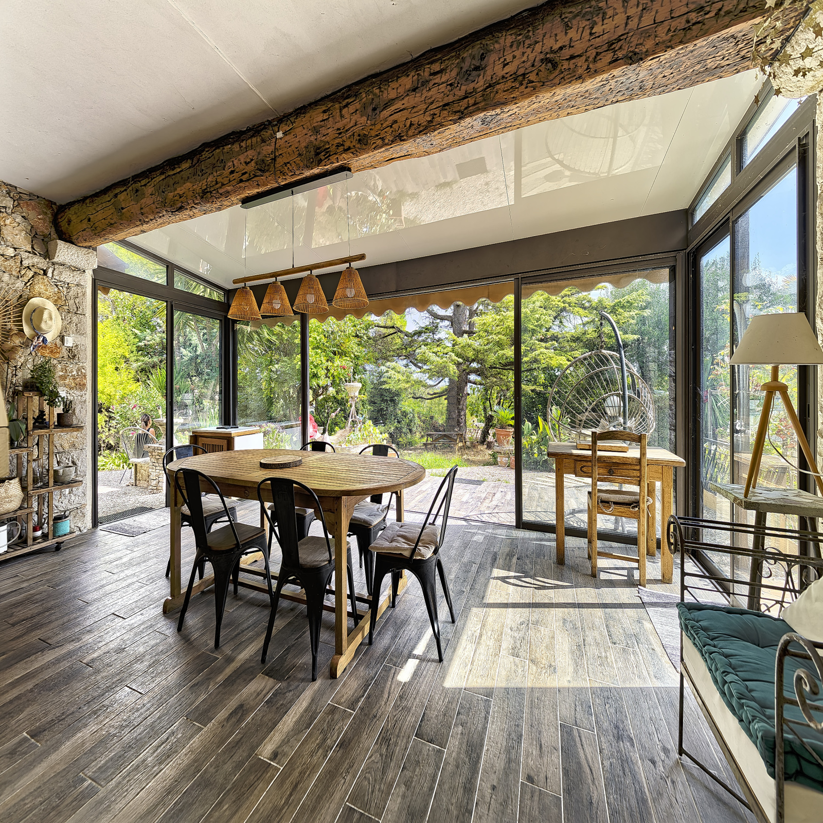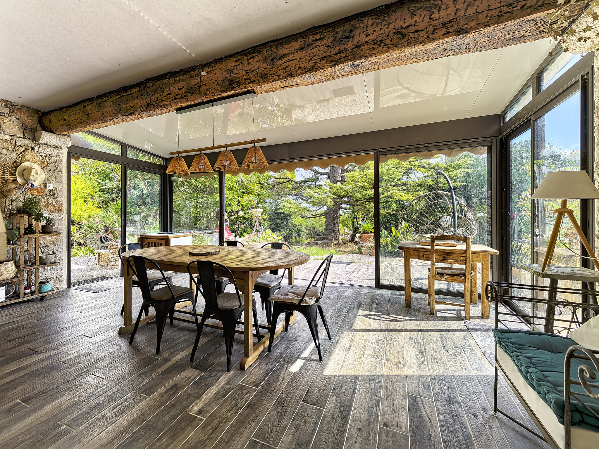 Dans un quartier résidentiel à quelques minutes du centre ville de Vence et de toutes commodités, cette charmante villa en pierres de plain-pied avec piscine rénovée en partie en 2023, est errigée sur un terrain de 2189m2, complantée d'arbres majestueux et d'essences méditéranéennes. Exposée sud, sud-ouest, cette villa de 172m2 avec un appartement de deux picèces indépendant, se compose de 5 pièces principales au total. Une belle entrèe spacieuse et accueillante donne sur un séjour de 37m2, une cuisisne ouverte sur le séjour, trois chambres dont une double avec chacune leur salle de bain ou salle d'eau. Une très belle véranda de 23m2 ouvrent sur le jardin, la piscine, et deux terrasses dont une avec un très bel espace cuisine d'été avec barbeccue et ferronerie intégré. Climatisation et double vitrage dans toutes les pièces. De nombreux stationnements extérieurs sur la propriété sont possibles, dont un sationnement couvert. Une annexe indépendante avec buanderie, une cave et un atelier complète le bien. La propriété bénéficie d'un dispositif de panneaux photovoltaïque (12m2) et de l'assainissement collectif.