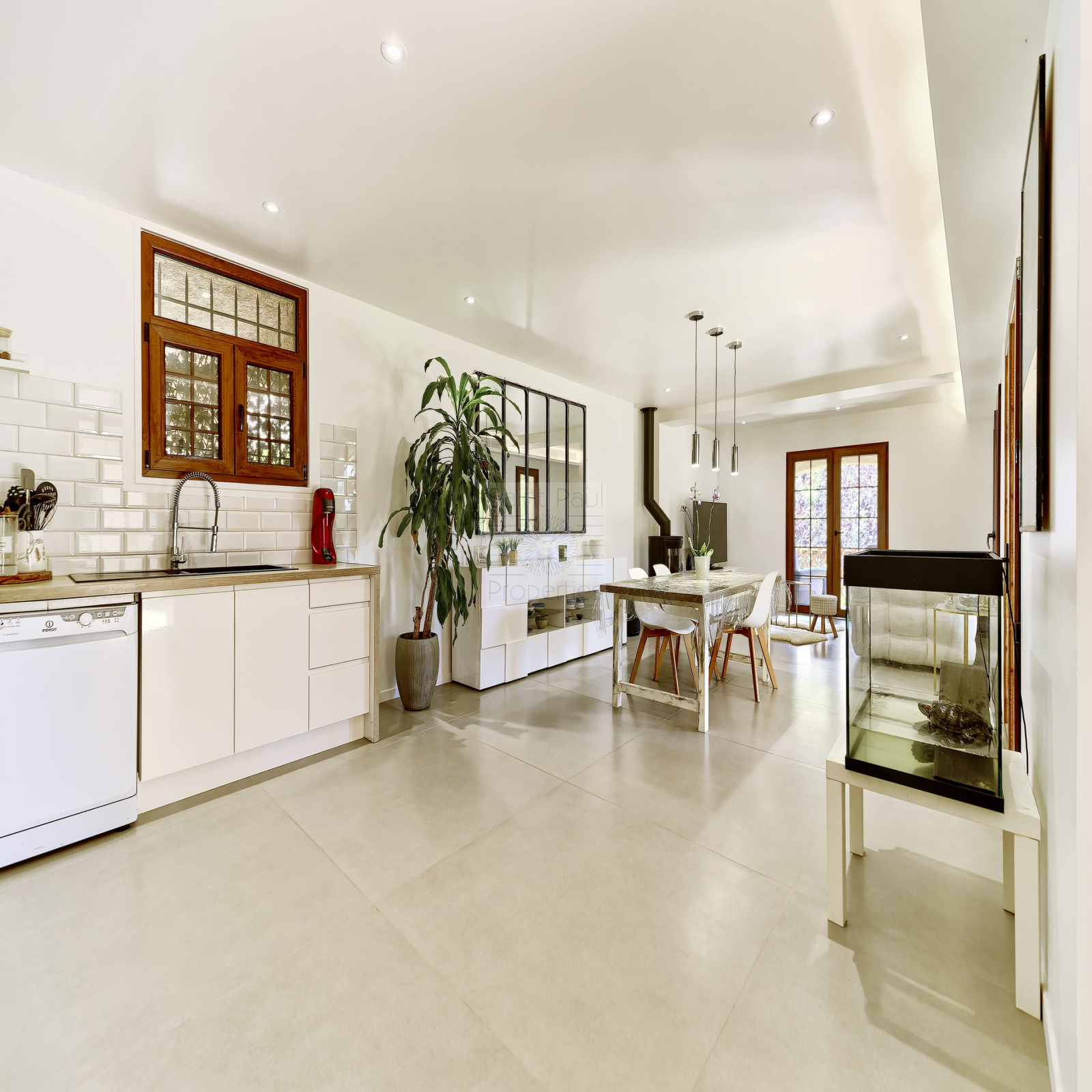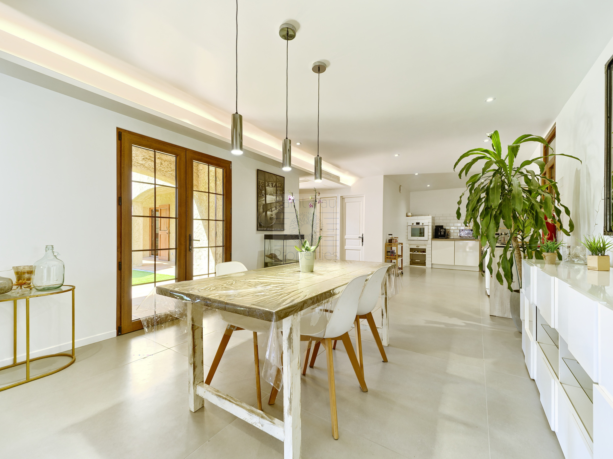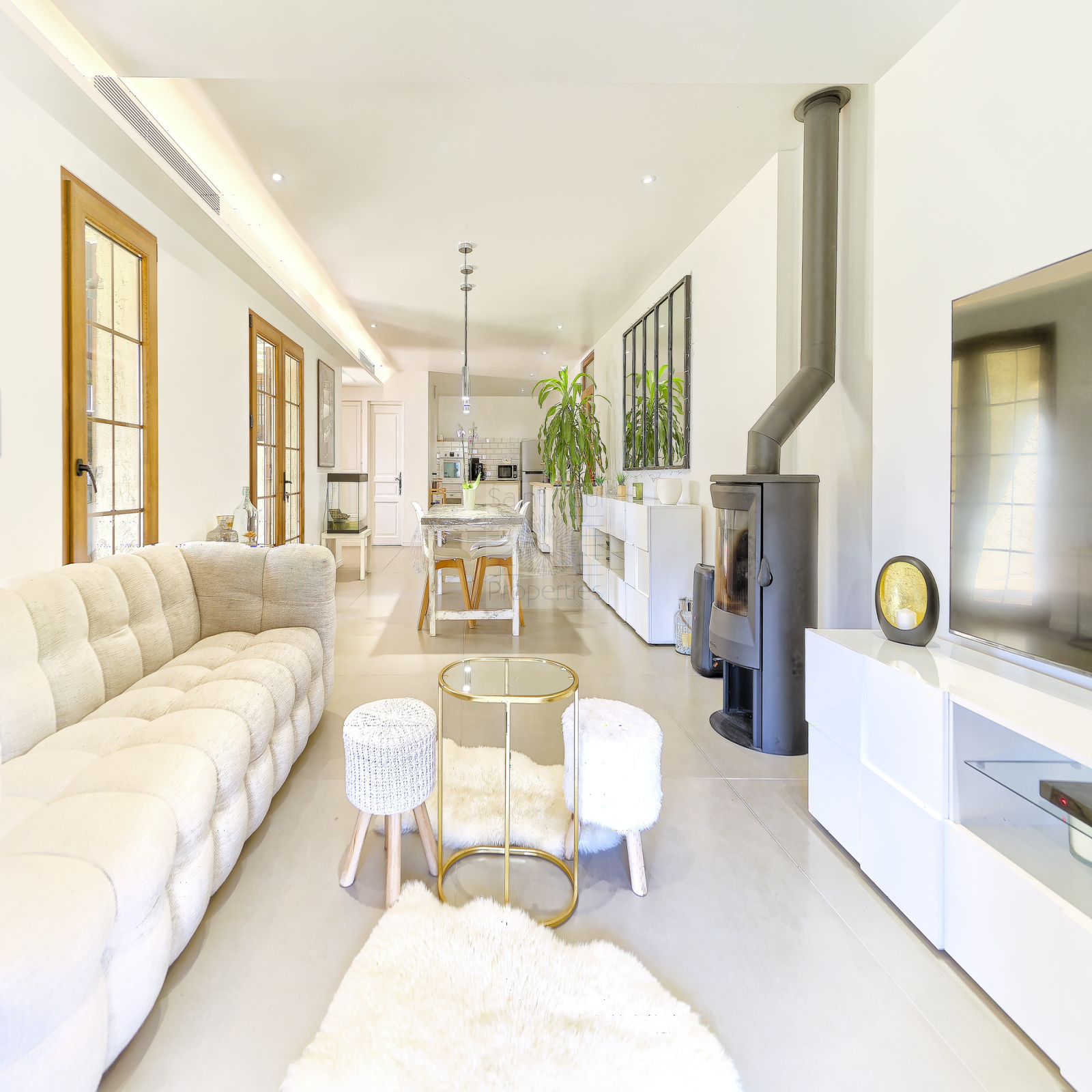 D'une superficie d'environ 138m2, ce bien d'exception entièrement de plain pied se compose de: une belle pièce à vivre très lumineuse avec son poêle à bois, un espace salle à manger, ainsi qu'une belle cuisine américaine parfaitement équipée, toilettes invités.