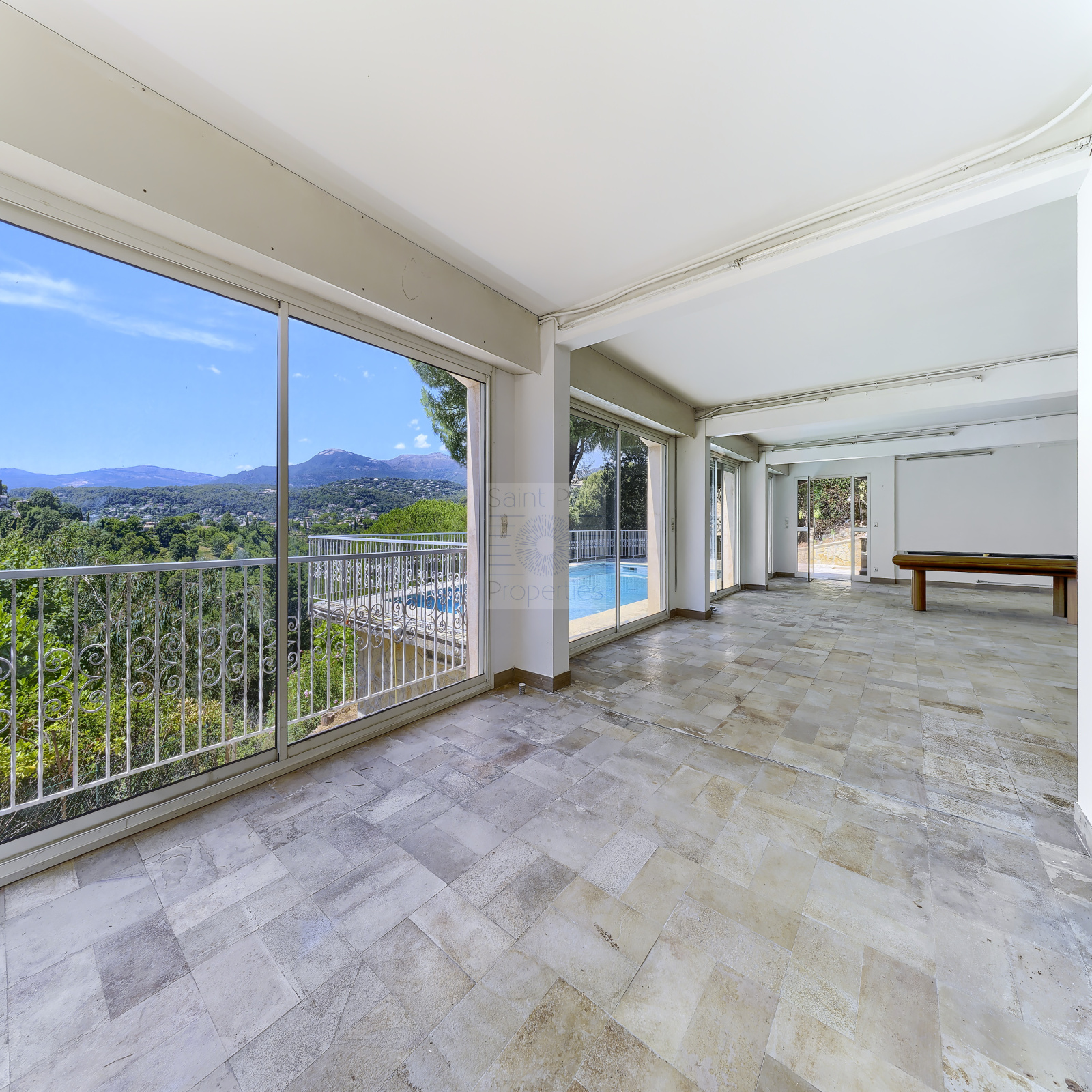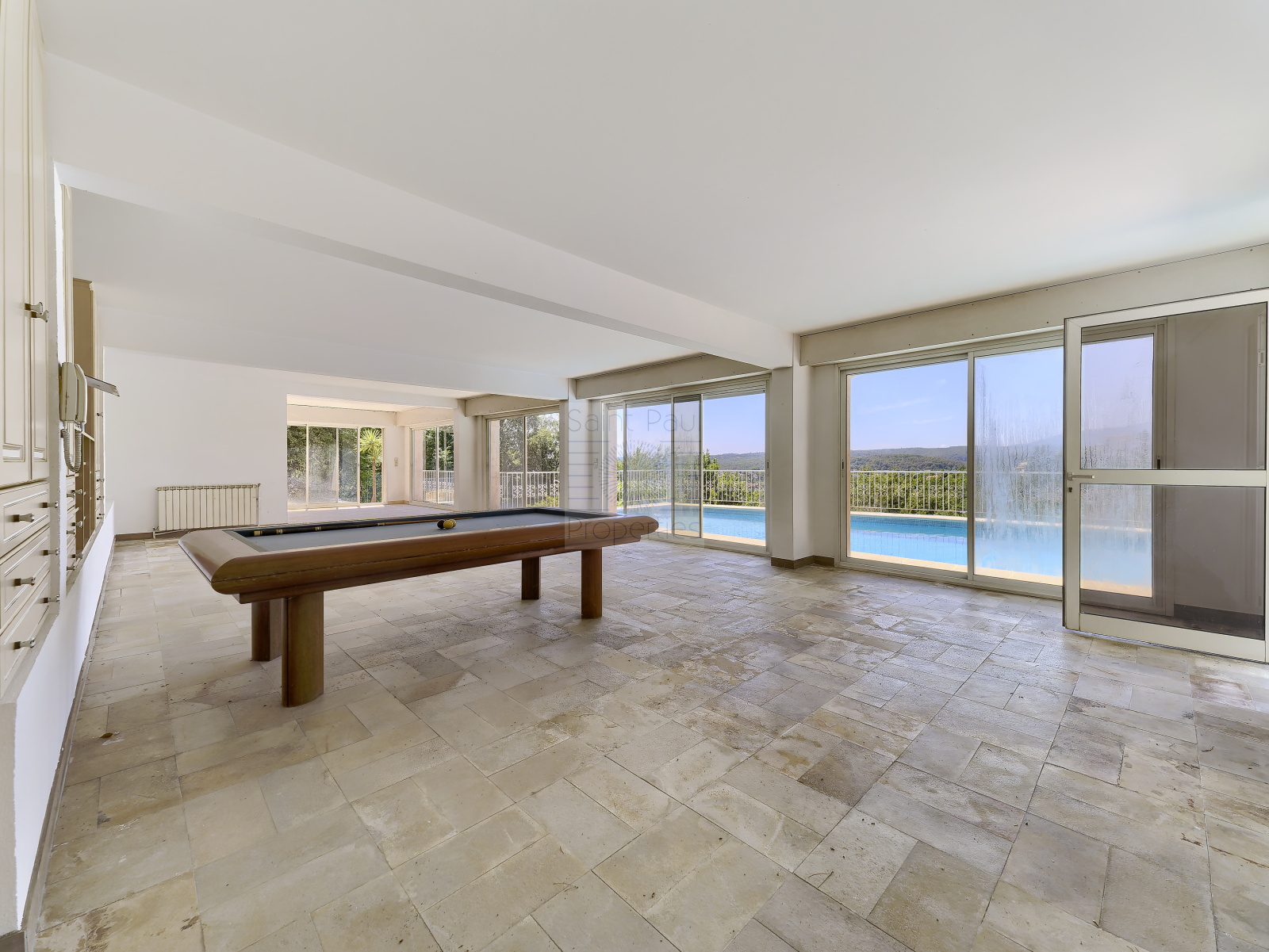 L'espace inférieur, se compose d'une grande pièce de vie qui pourrait être une salle de jeux, salle de sport... donnant sur la piscine et terrasse.