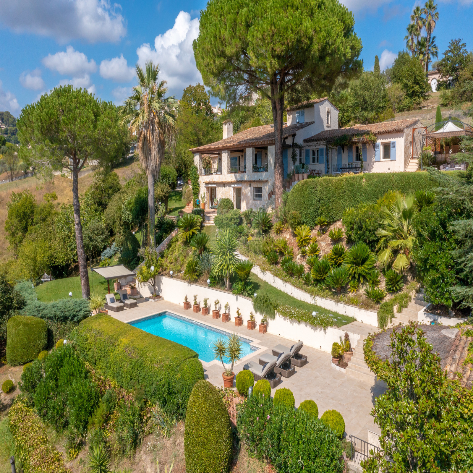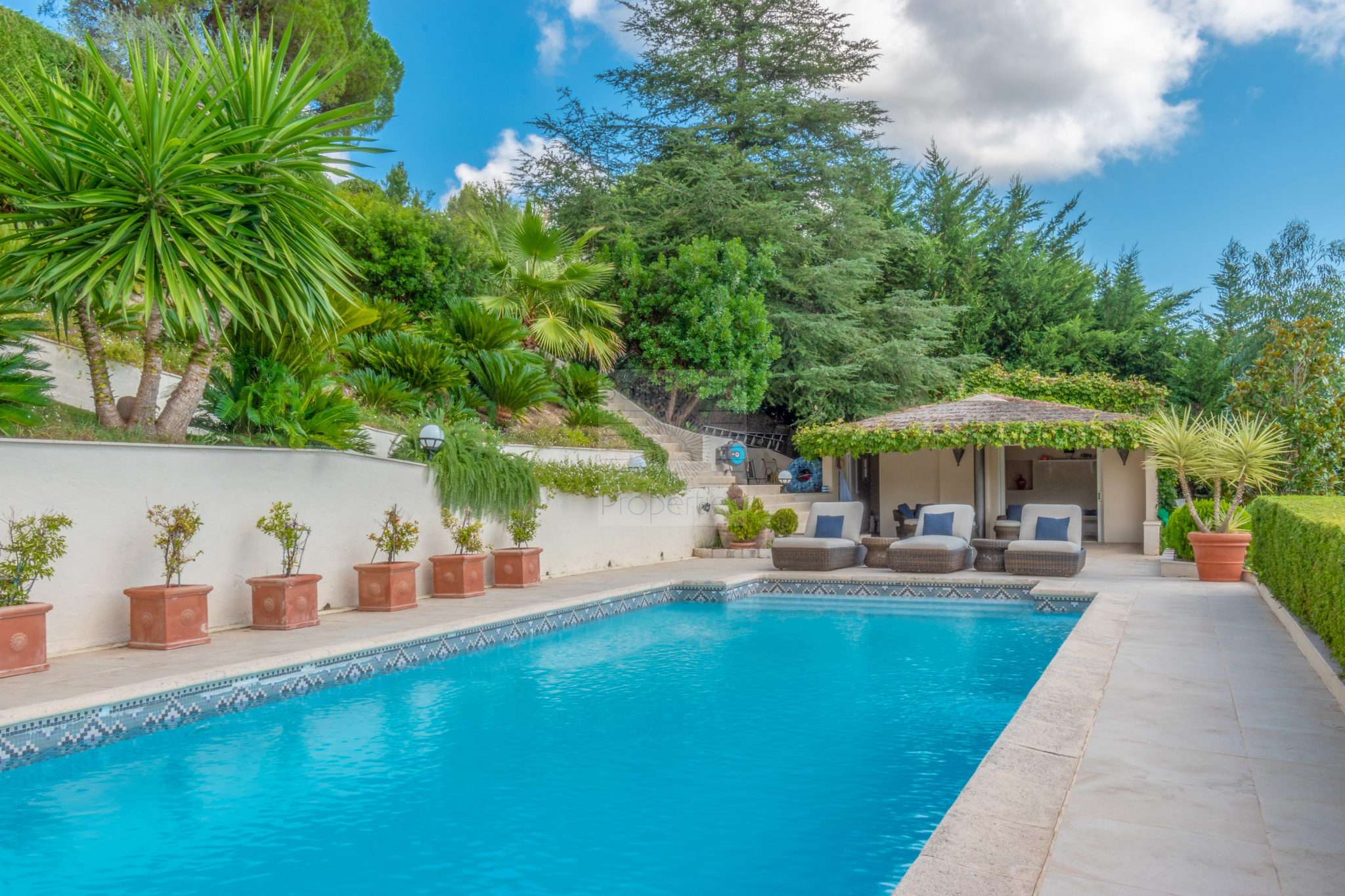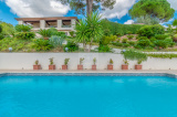 A l'Extérieur: de nombreux espaces parfaitement paysagés permettront à de nombreux convives d'apprécier les lieux en toute quiétude, un superbe espace piscine ( mosaïque, système au sel) avec son pool-house proposant un salon d'Eté et douche - toilettes), une chambre d'appoint. Un court de tennis vient parfaire l'ensemble.