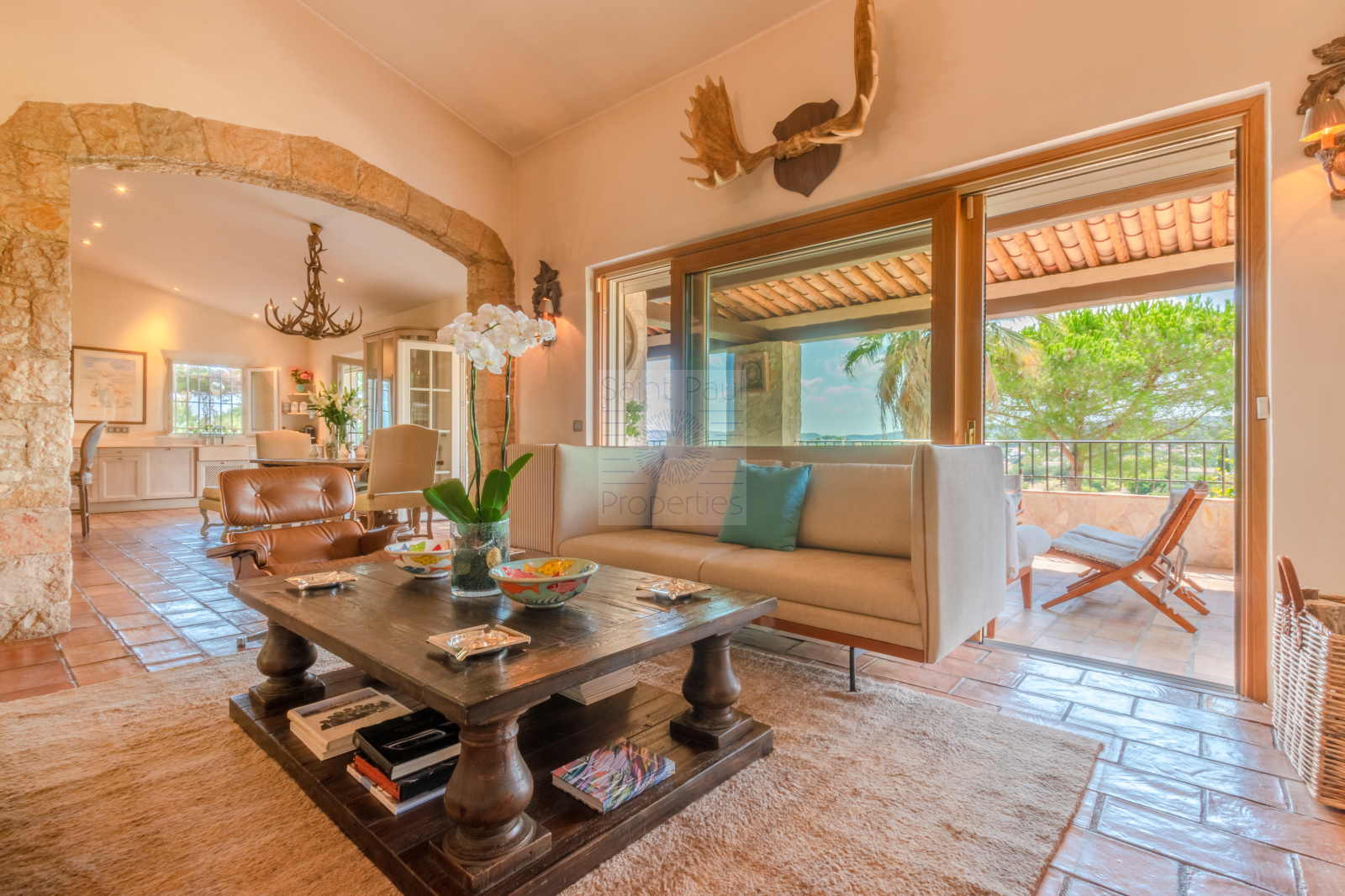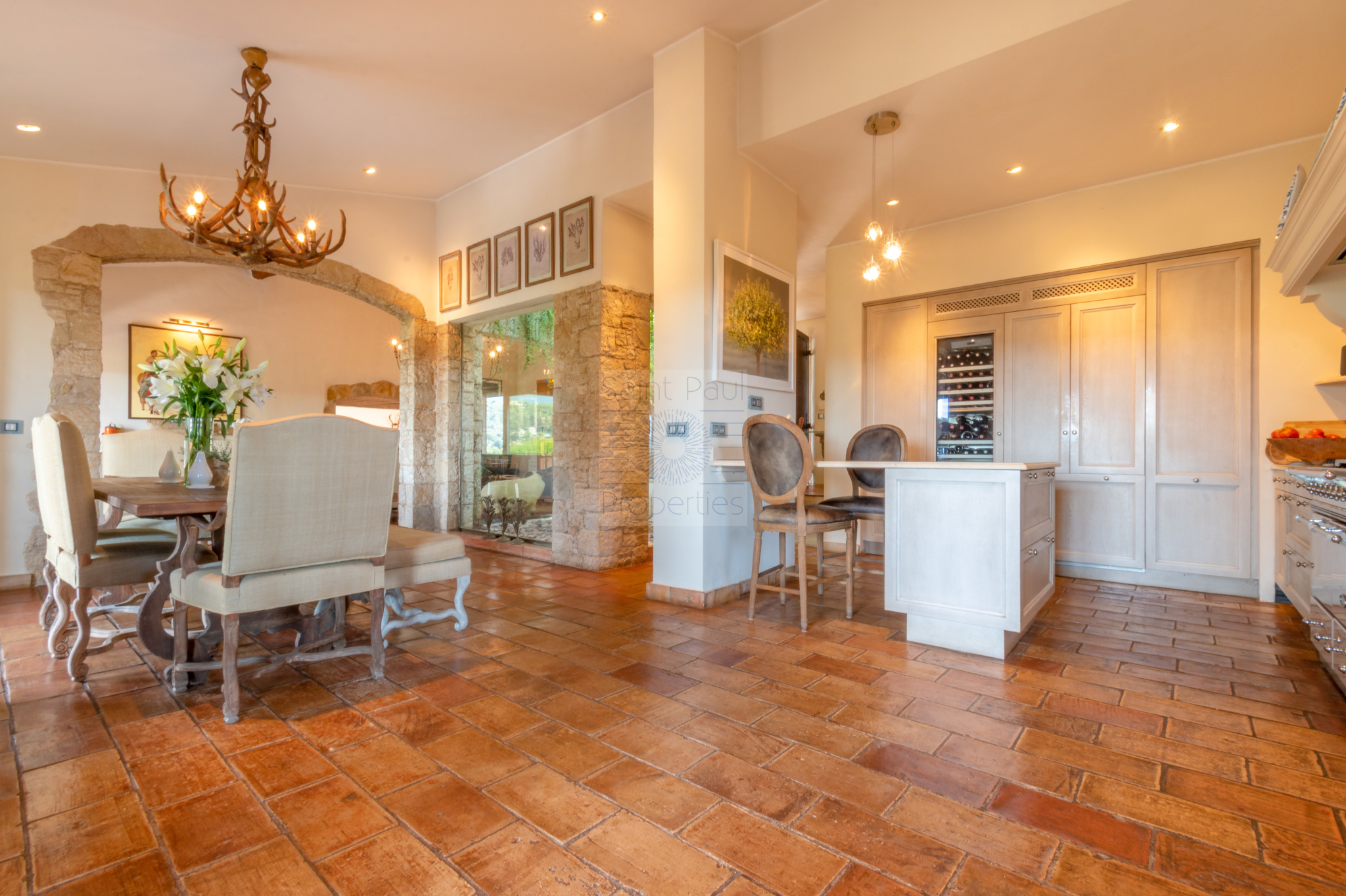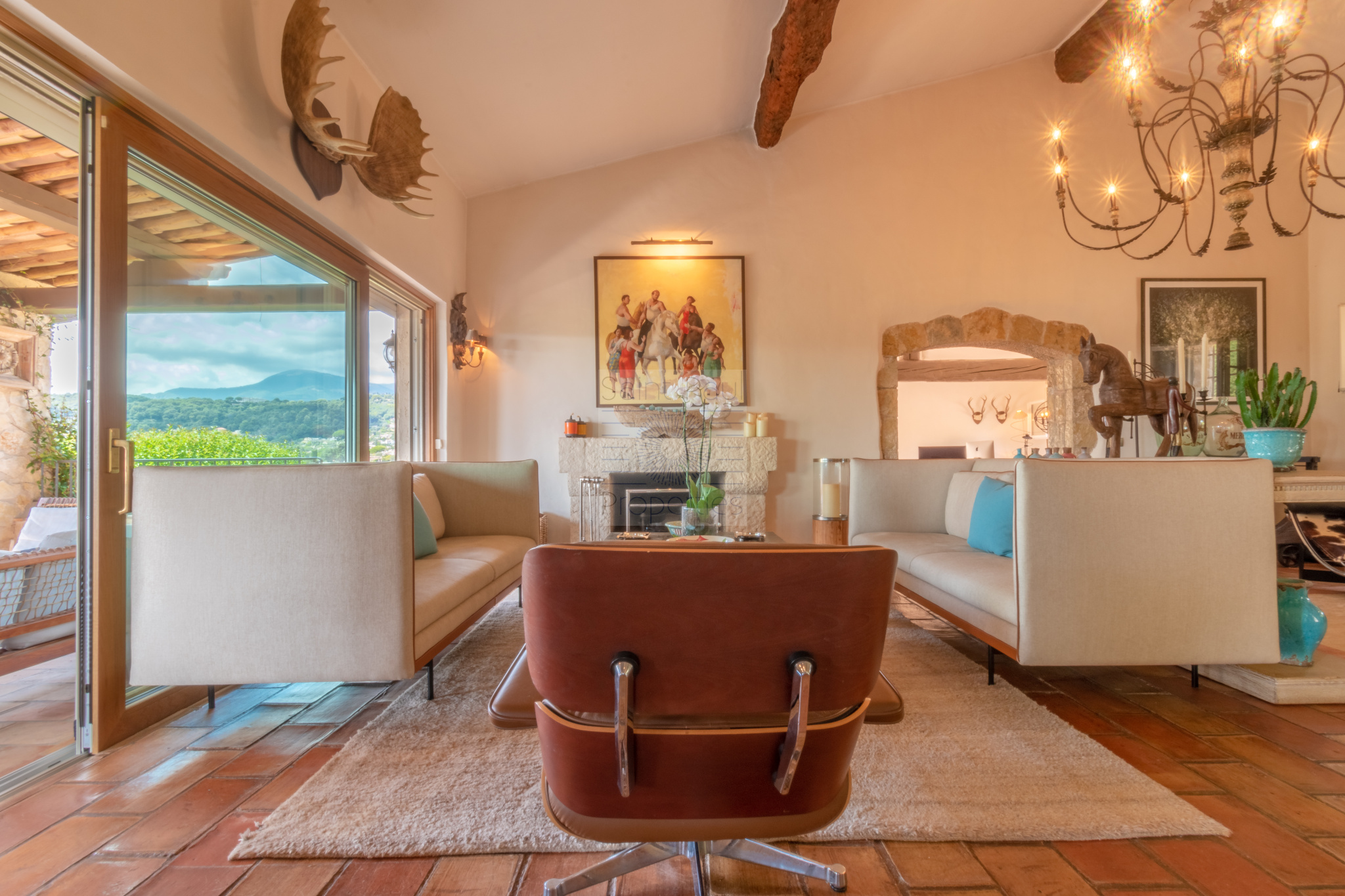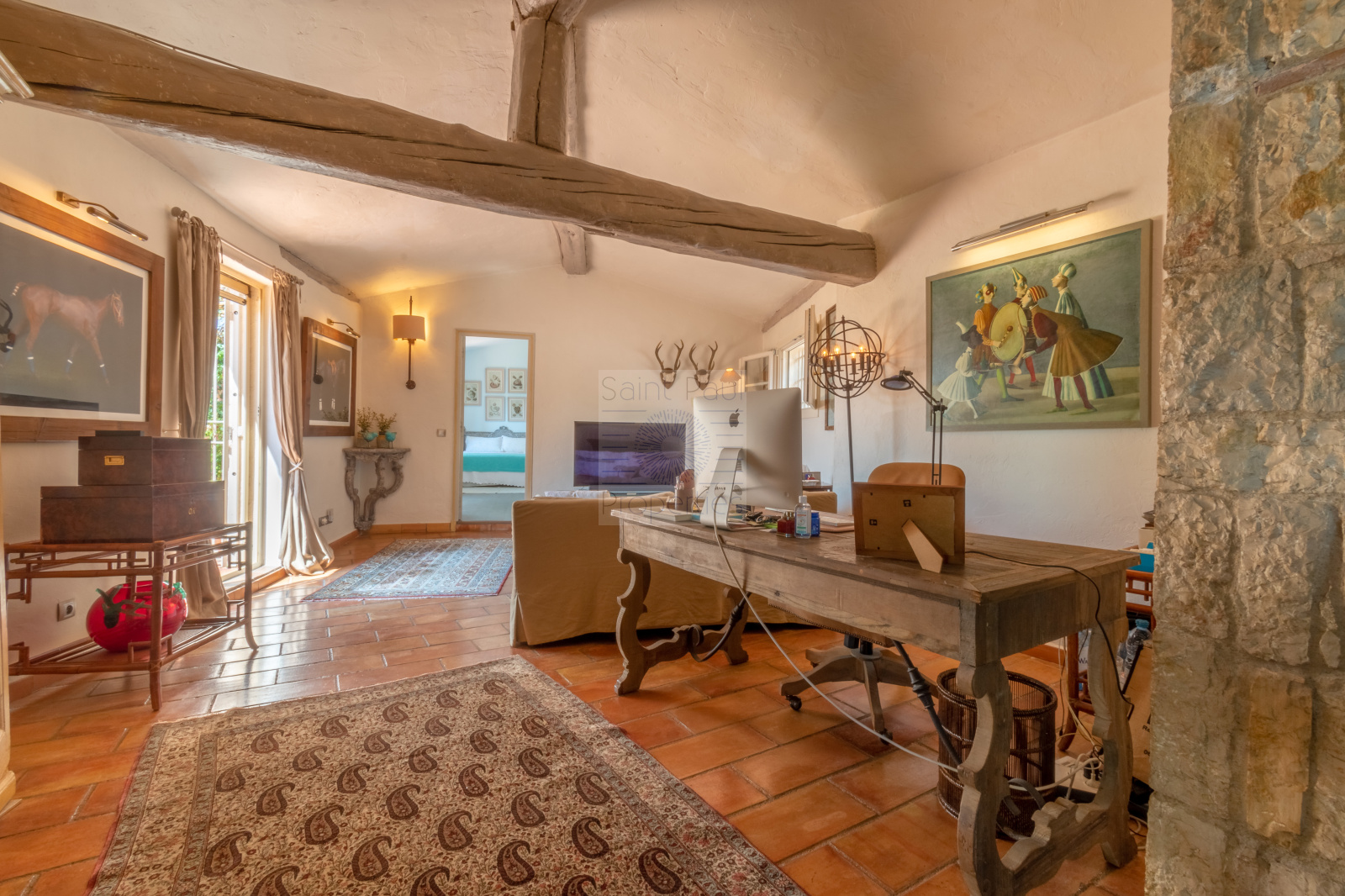 Niveau principal: une majestueuse entrée, un spacieux séjour avec cheminée et très belle hauteur sous plafond, poutres apparentes, une cuisine américaine parfaitement équipée, le tout ouvrant sur une immense terrasse couverte invitant à la convivialité et la détente. Sur ce même étage, on retrouve l'espace chambre de maître avec son bureau privatif, salle de bain ( baignoire et douche), et dressing. Un charmant salon tv / bureau, une autre spacieuse chambre avec sa salle de douche.