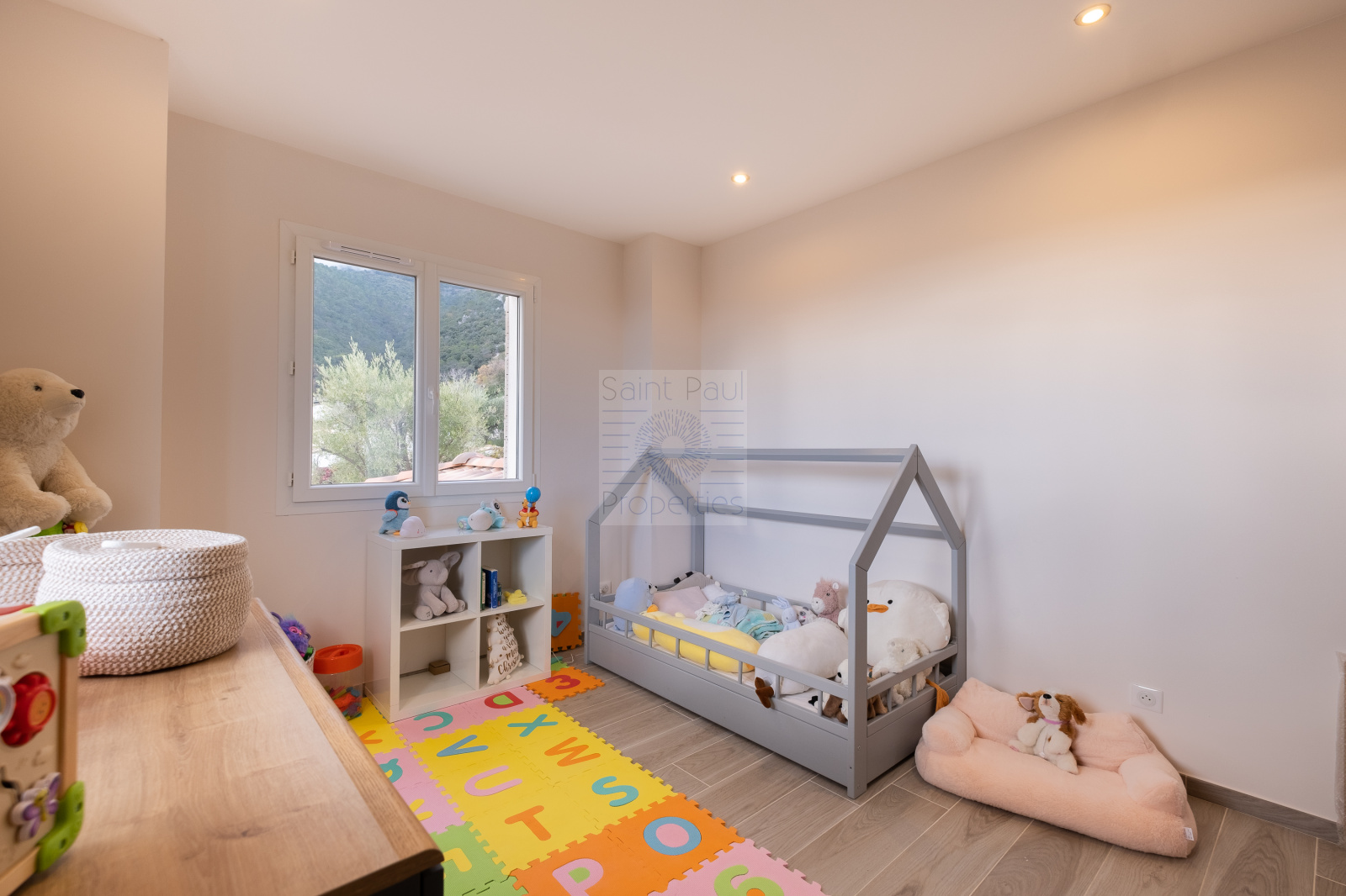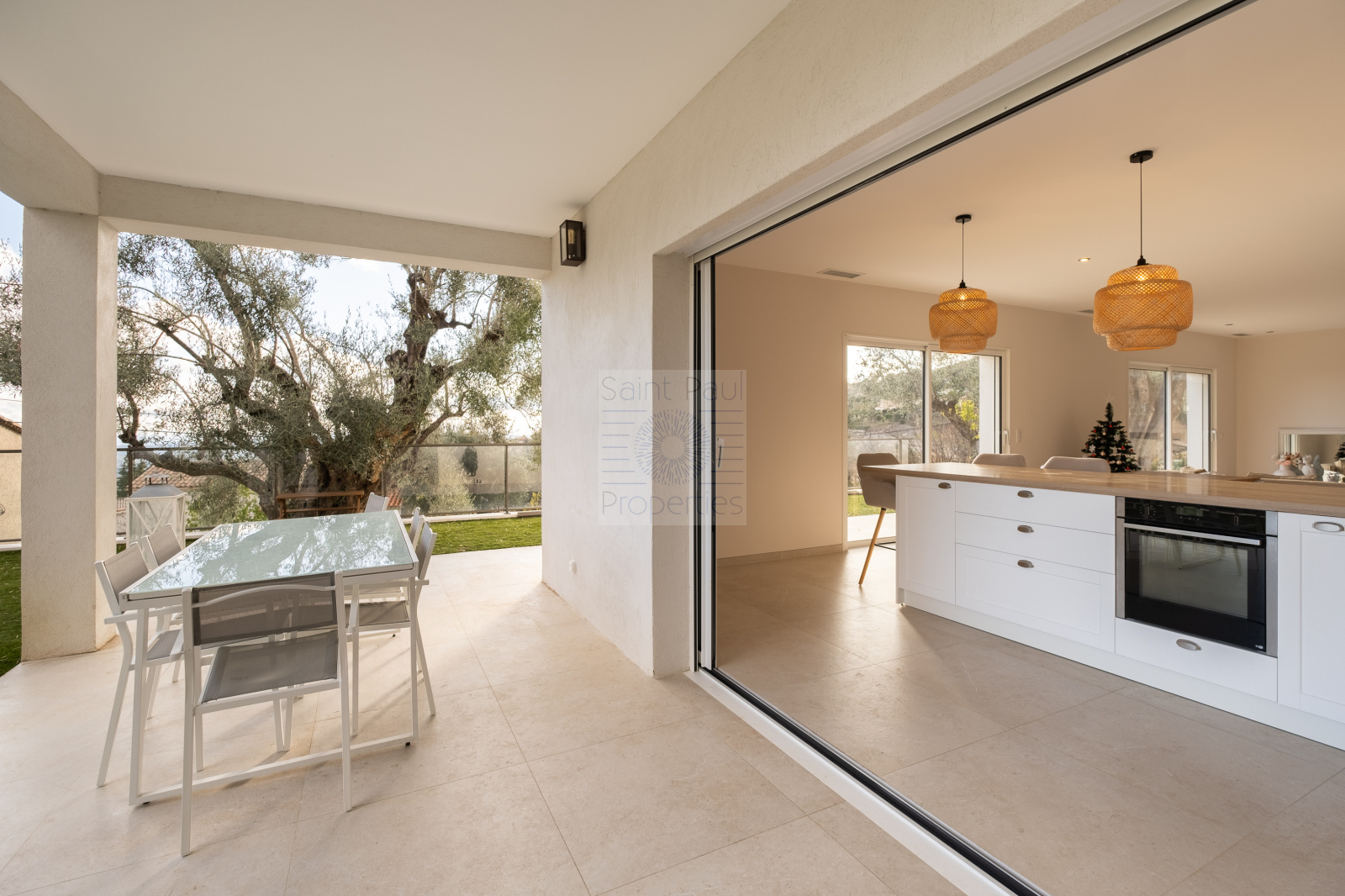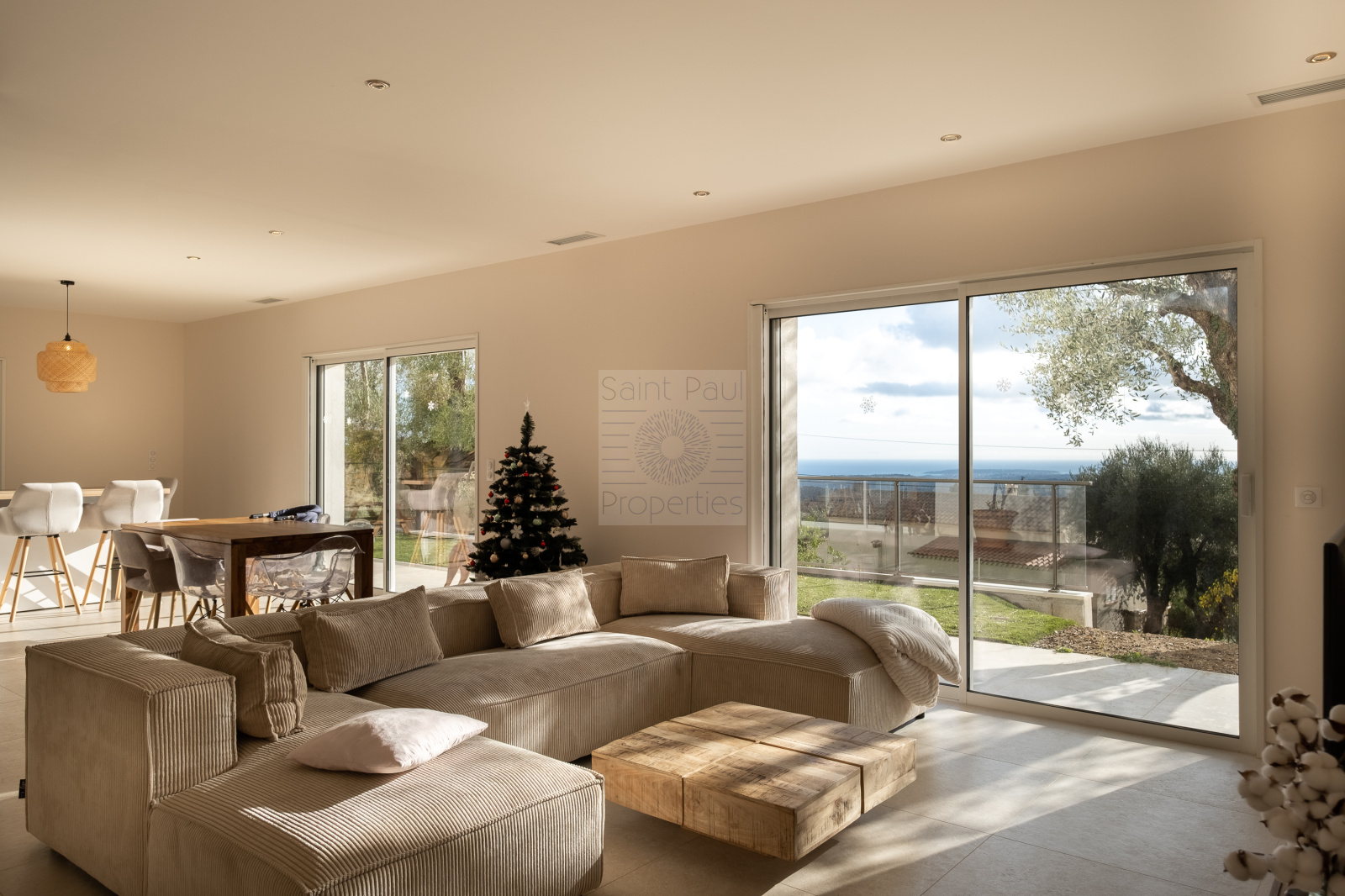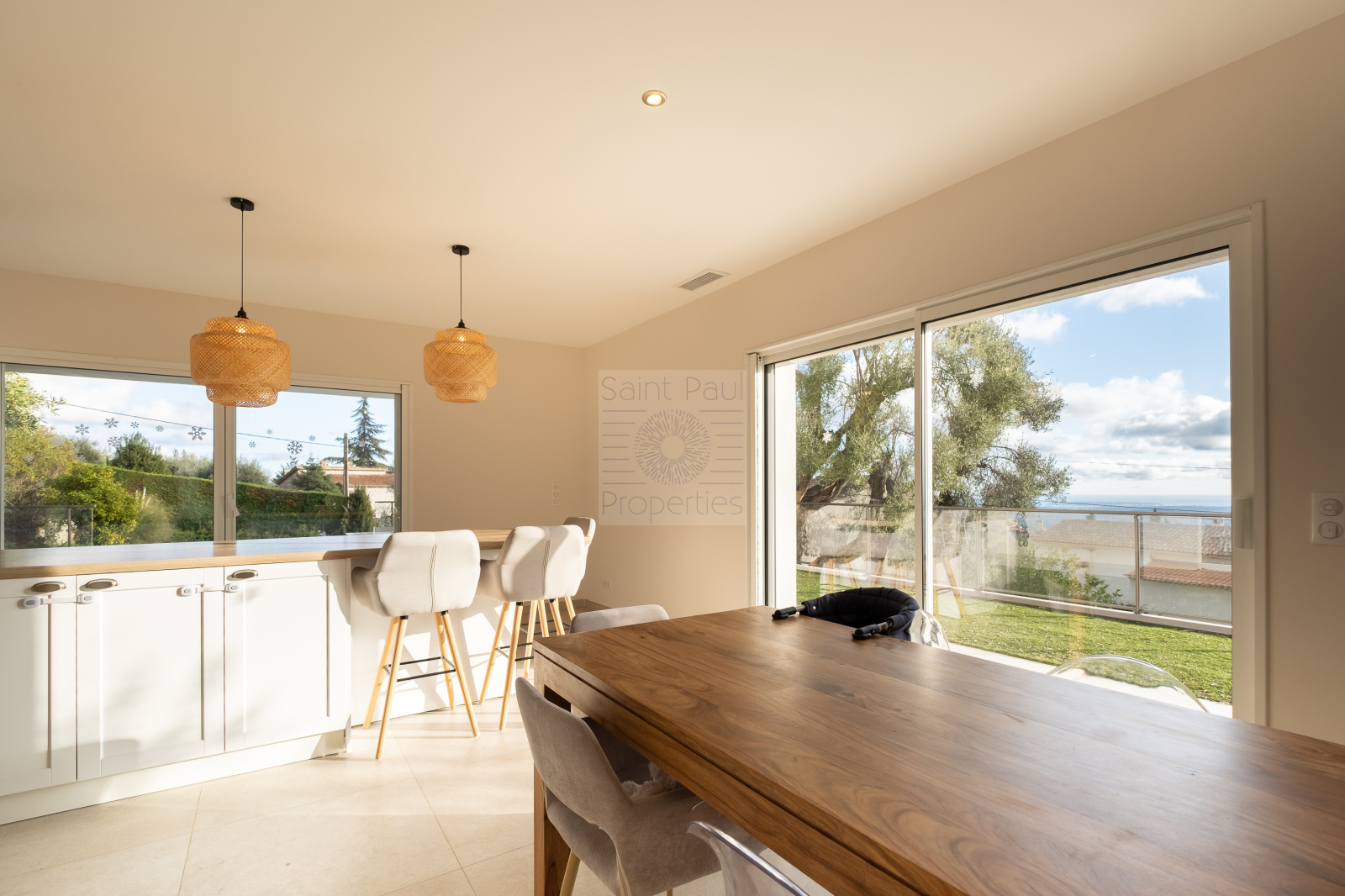 EXCLUSIVITE St Paul Properties : Bastide construite en 2023, d'une surface de 147m2 habitables érigée sur une parcelle de terrain de 1163m2. A seulement 300m à pied du village Très lumineuse et parfaitement agencée, son exposition plein sud et sud-ouest offre un ensoleillement total et une vue magnifique sur la mer jusqu'au Cap d'Antibes. Elle se compose, de plain-pied, d'une entrée spacieuse, d'une chambre parentale avec salle d'eau et dressing, d'un salon avec toilettes invités, d'une salle à manger avec une grande cuisine ouverte de menuiseries italiennes, donnant sur une terrasse de 48m2. Un cellier, utile et fonctionnel, de style verrière parisienne complète la cuisine. A l'étage, 3 Chambres vue mer et collines, très lumineuses, une salle de bain et un wc suspendu indépendant. Climatisation réversible gainée, double vitrage à galandage, 3 stationnements extérieurs et un garage fermé attenant de 22m2 avec buanderie complètent ce bien. De nombreuses prestations apportent confort et sécurité : Portail électrique, visiophone, porte blindée 5 points avec serrure à empreinte digitale, climatisation, volets et lumière connectés. Un permis accepté et purgé pour une piscine d'une dimension de 4x8m. Assainissement collectif. Une opportunité unique à saisir. Photo avec "projection" piscine implantée sur demande.
