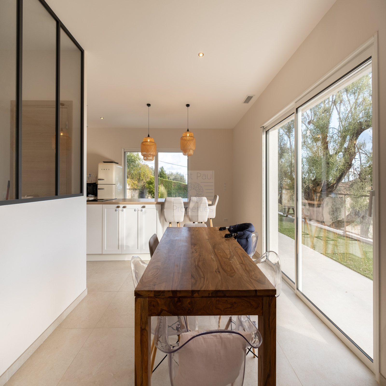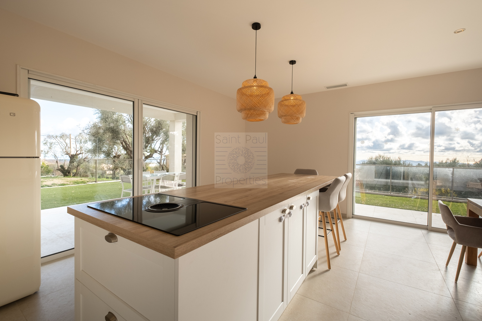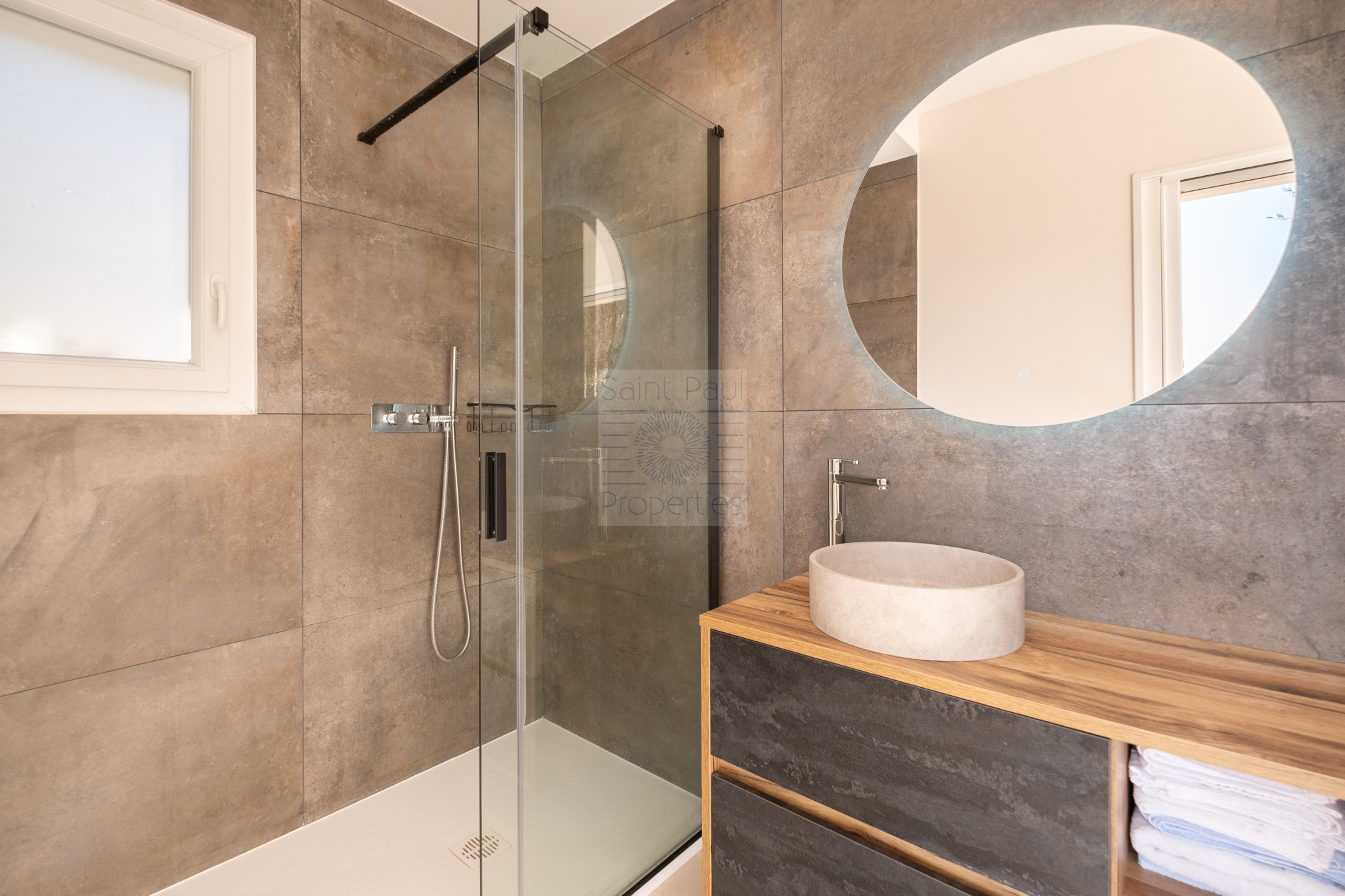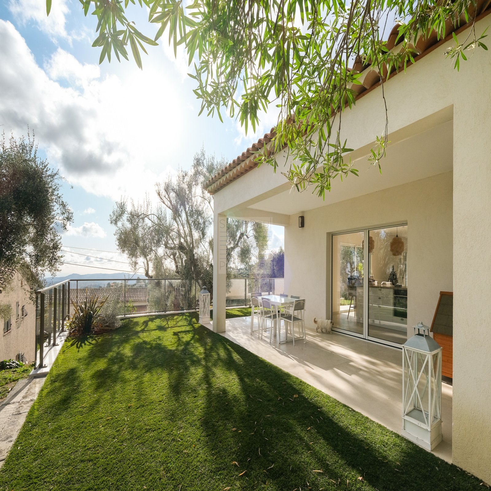 EXCLUSIVITE St Paul Properties : Bastide construite en 2023, d'une surface de 147m2 habitables érigée sur une parcelle de terrain de 1163m2. A seulement 300m à pied du village Très lumineuse et parfaitement agencée, son exposition plein sud et sud-ouest offre un ensoleillement total et une vue magnifique sur la mer jusqu'au Cap d'Antibes. Elle se compose, de plain-pied, d'une entrée spacieuse, d'une chambre parentale avec salle d'eau et dressing, d'un salon avec toilettes invités, d'une salle à manger avec une grande cuisine ouverte de menuiseries italiennes, donnant sur une terrasse de 48m2. Un cellier, utile et fonctionnel, de style verrière parisienne complète la cuisine. A l'étage, 3 Chambres vue mer et collines, très lumineuses, une salle de bain et un wc suspendu indépendant. Climatisation réversible gainée, double vitrage à galandage, 3 stationnements extérieurs et un garage fermé attenant de 22m2 avec buanderie complètent ce bien. De nombreuses prestations apportent confort et sécurité : Portail électrique, visiophone, porte blindée 5 points avec serrure à empreinte digitale, climatisation, volets et lumière connectés. Un permis accepté et purgé pour une piscine d'une dimension de 4x8m. Assainissement collectif. Une opportunité unique à saisir. Photo avec "projection" piscine implantée sur demande.