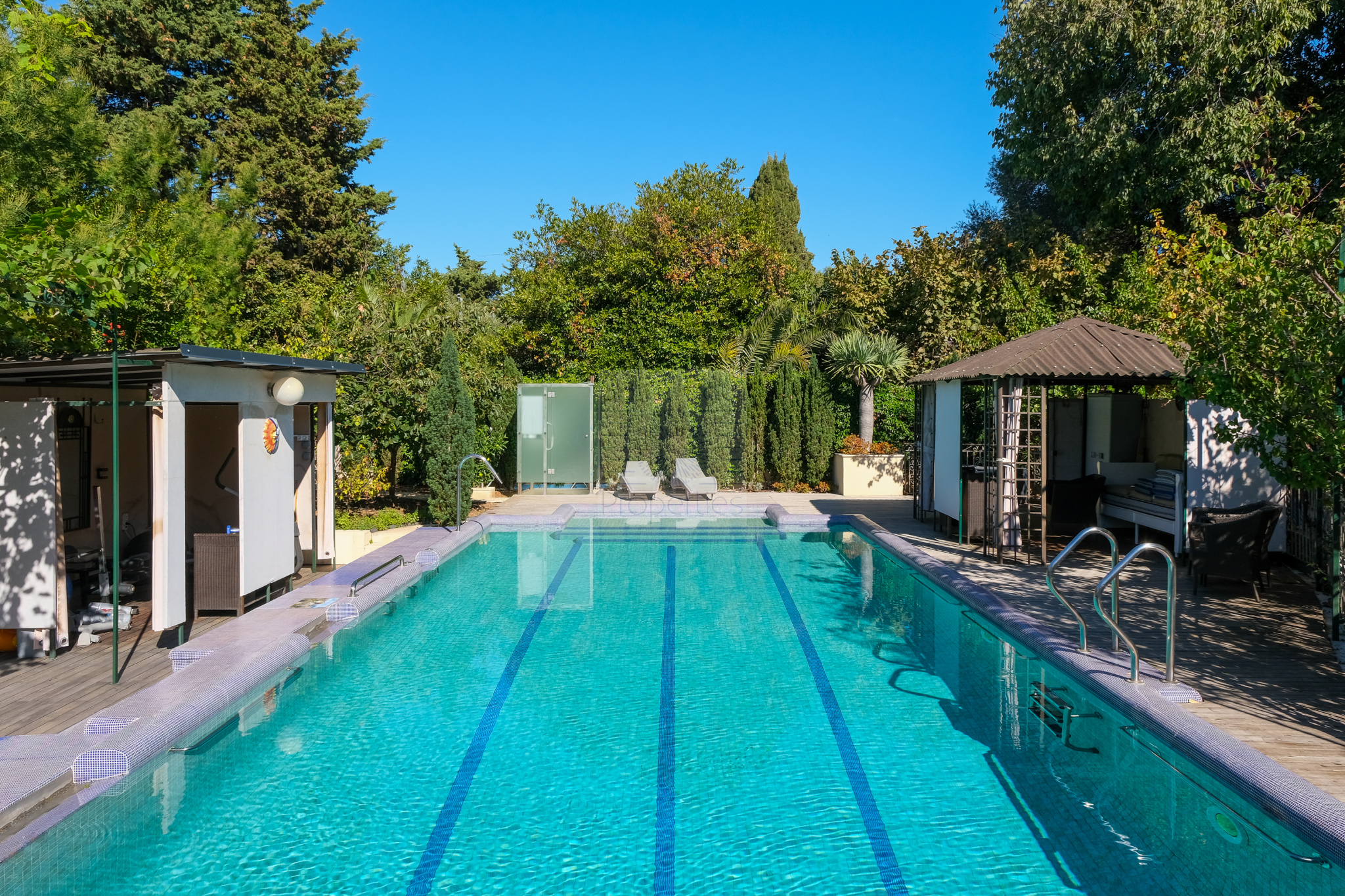 L'espace piscine est très convivial: grande piscine de 15mX6 en mosaique, un espace salle de sports et un salon d'été avec sa pergola. Une immense cuisine d'été, complètement équipée et couverte, permet de recevoir une douzaine de personnes.