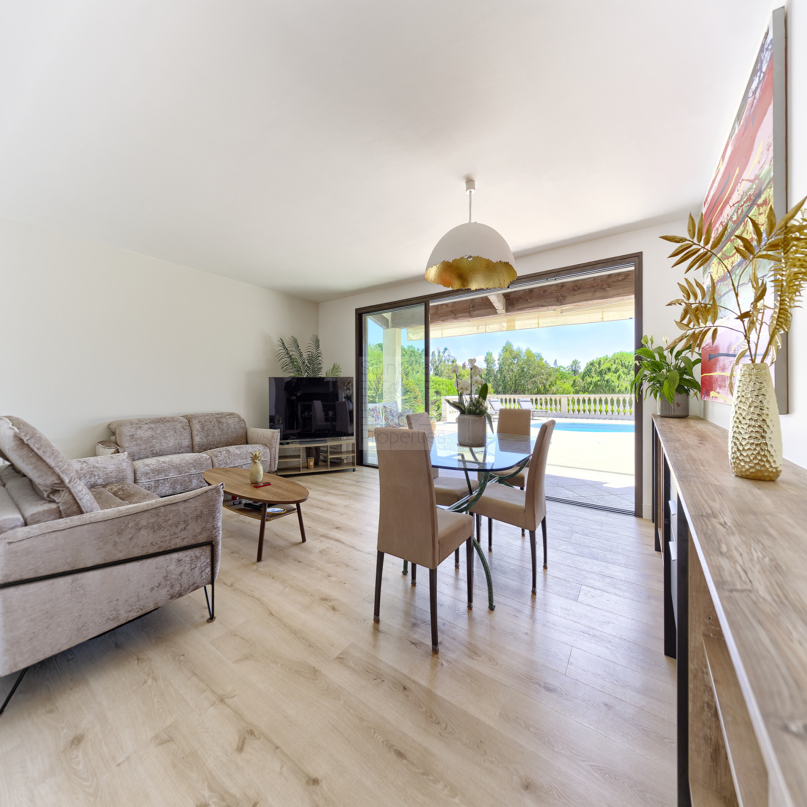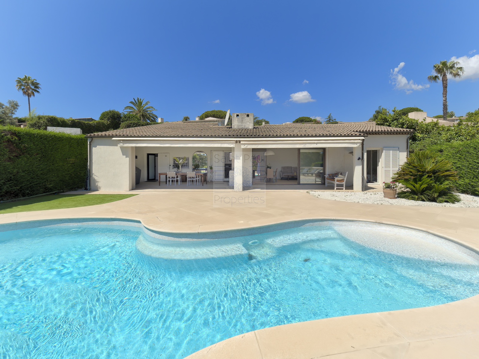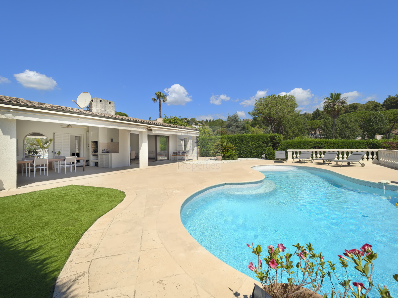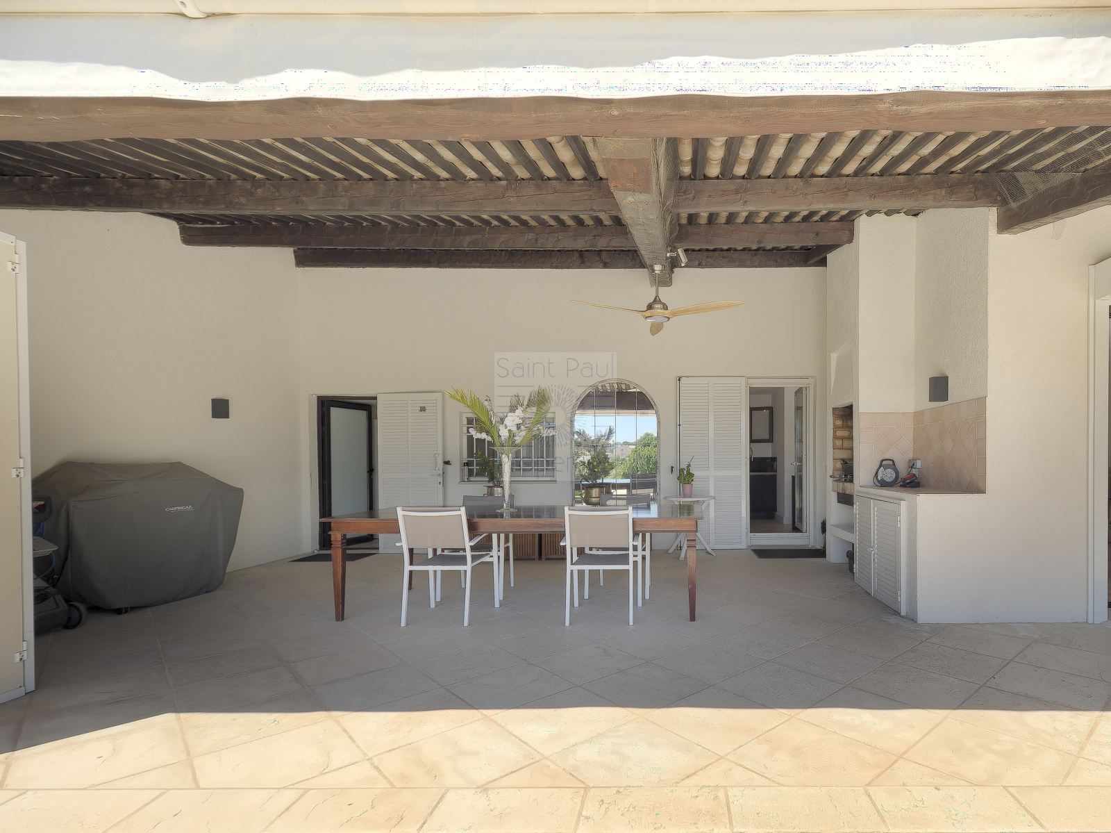 A l'extérieur, nous avons une terrasse côté entrée, ainsi qu'un grand espace à vivre couvert coté piscine avec barbecue et buanderie.
