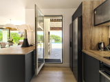 Placard donnant sur un espace séjour et cuisine ouverte neuve et entièrement équipée avec accès terrasse extérieure.