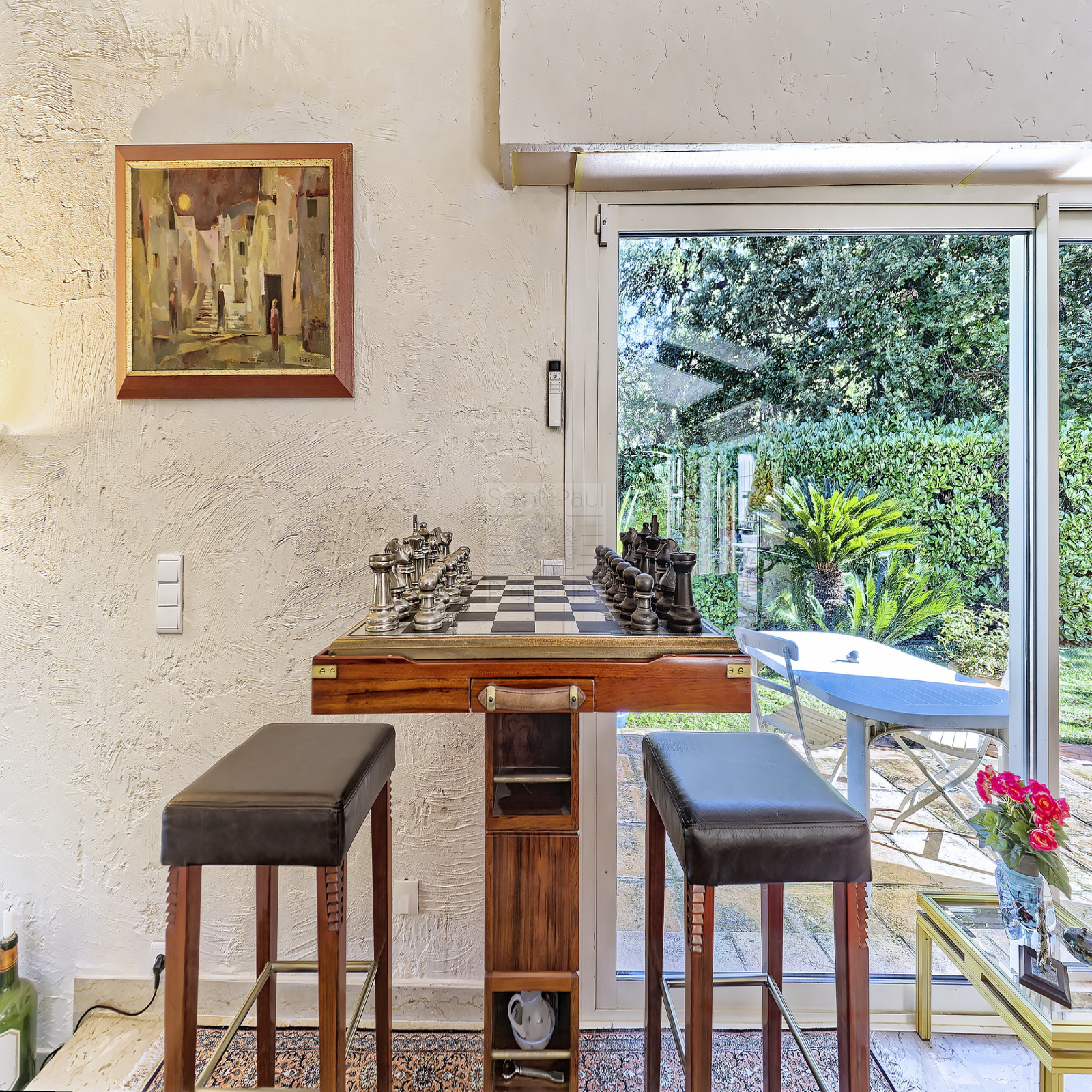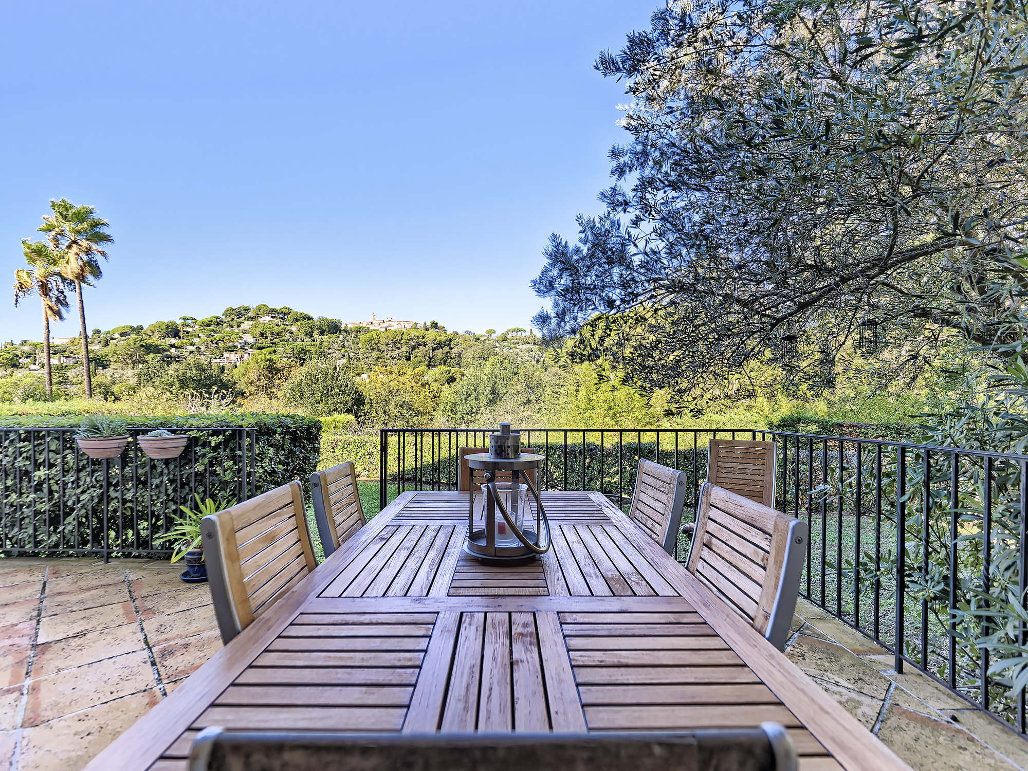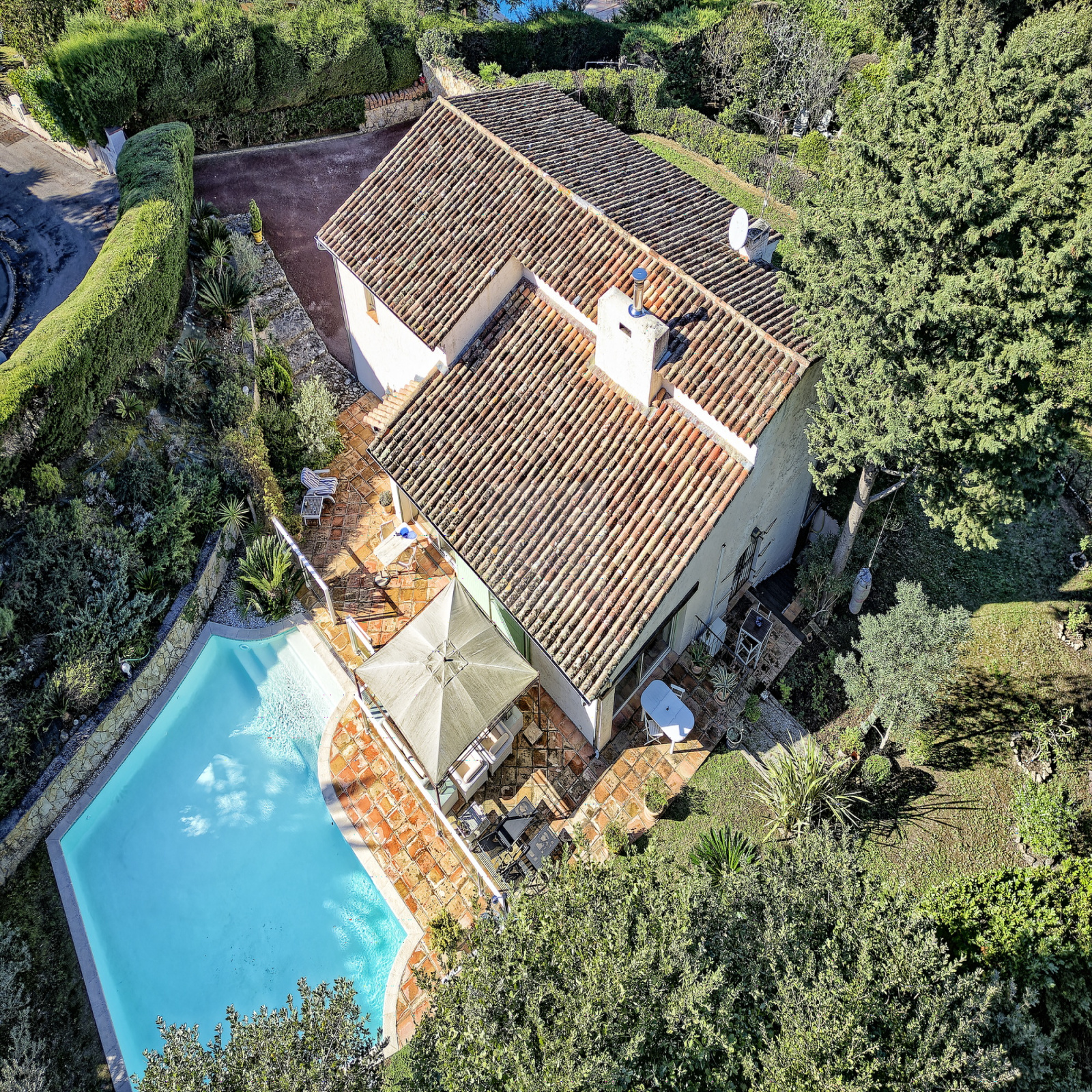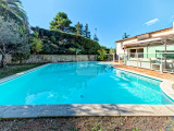 A l’extérieur, grande piscine au sel de forme libre bordée par un agréable espace lounge, jardin parfaitement complanté organisé en profondes restanques, garage fermé et nombreuses places de stationnement. Arrosage automatique, système d’alarme, climatisation reversible.