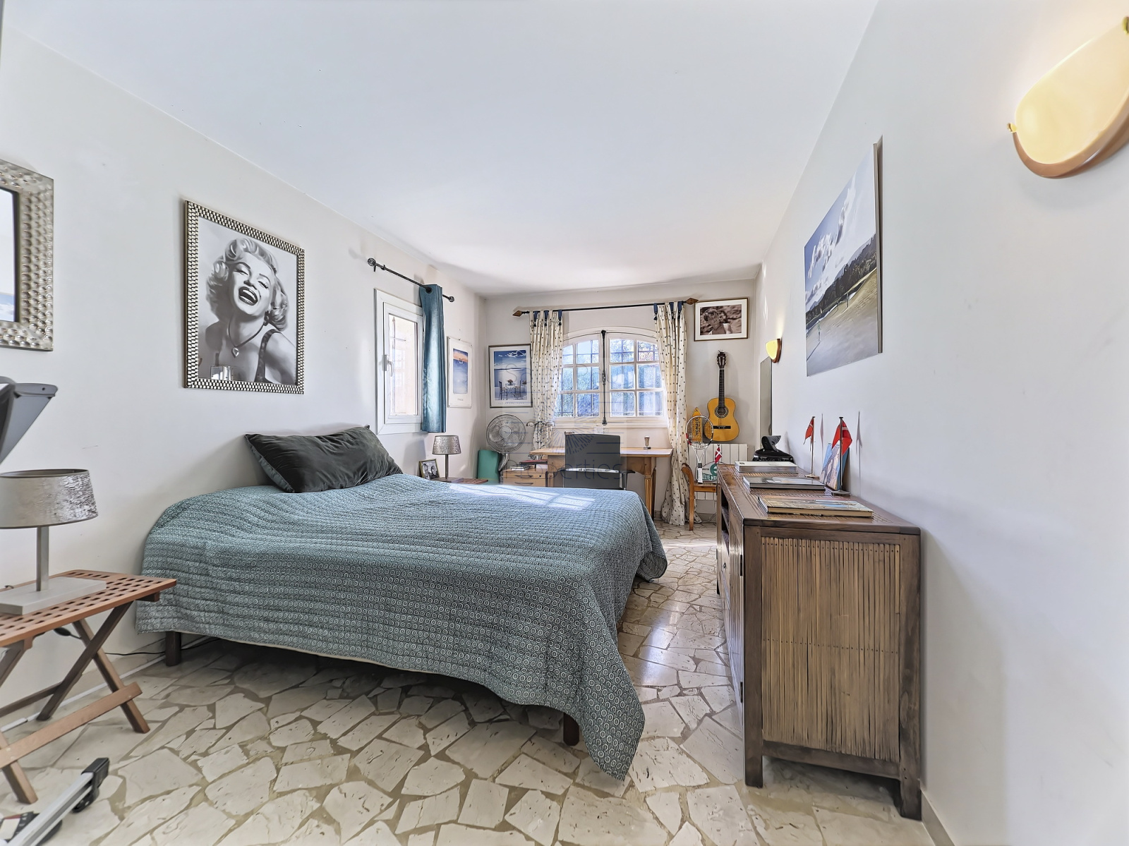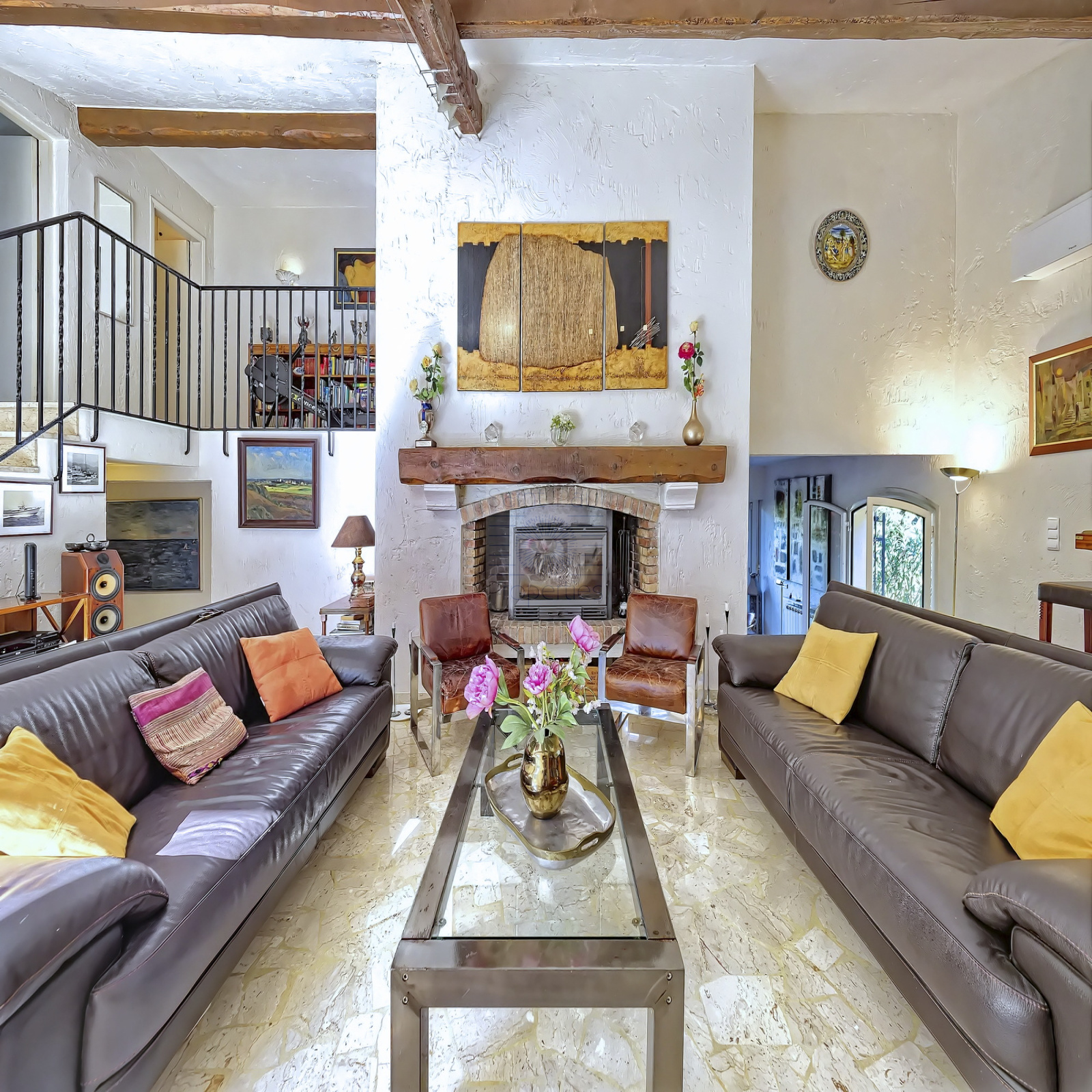 Vaste séjour avec cheminée bénéficiant d’une très belle hauteur sous plafond, salle à manger indépendante avec terrasse barbecue attenante à une cuisine parfaitement équipée, une chambre en suite, un bureau/ chambre.