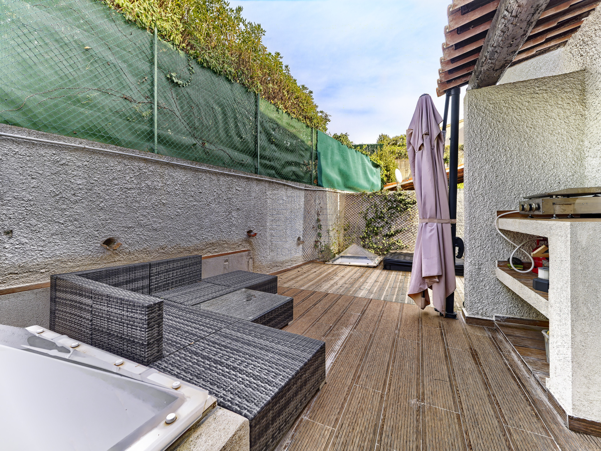 Au 1er étage, un large salon très lumineux, belle cuisine ouverte, une belle terrasse plein sud avec la vue mer et une autre a l'arrière avec son jacuzzi et coin repas.